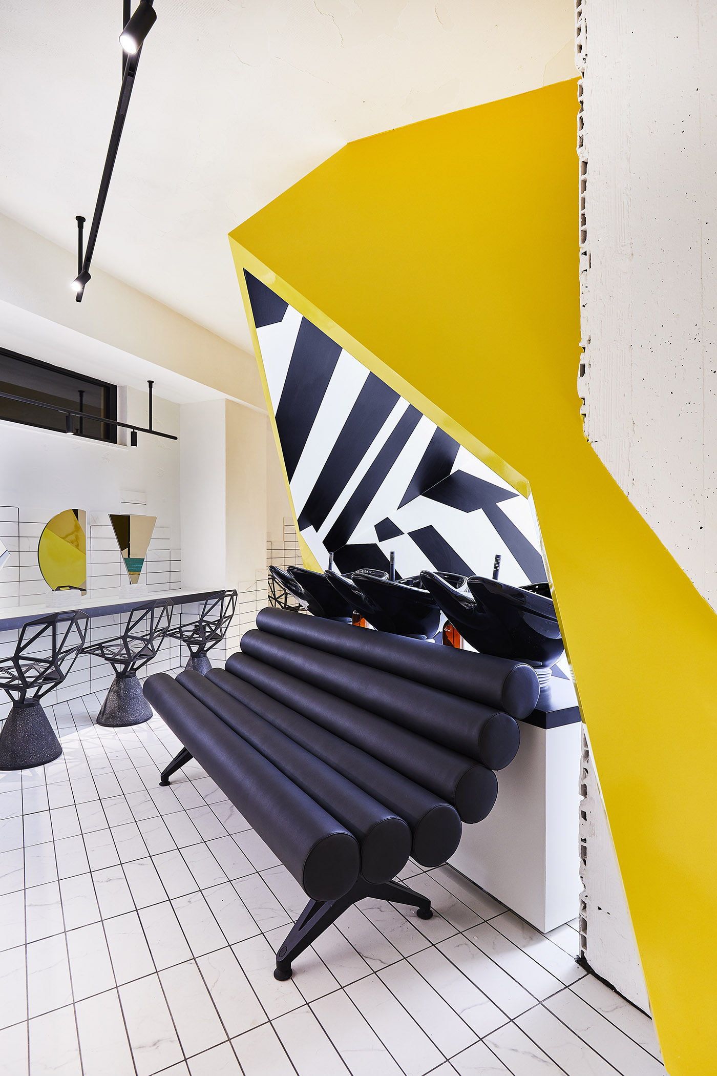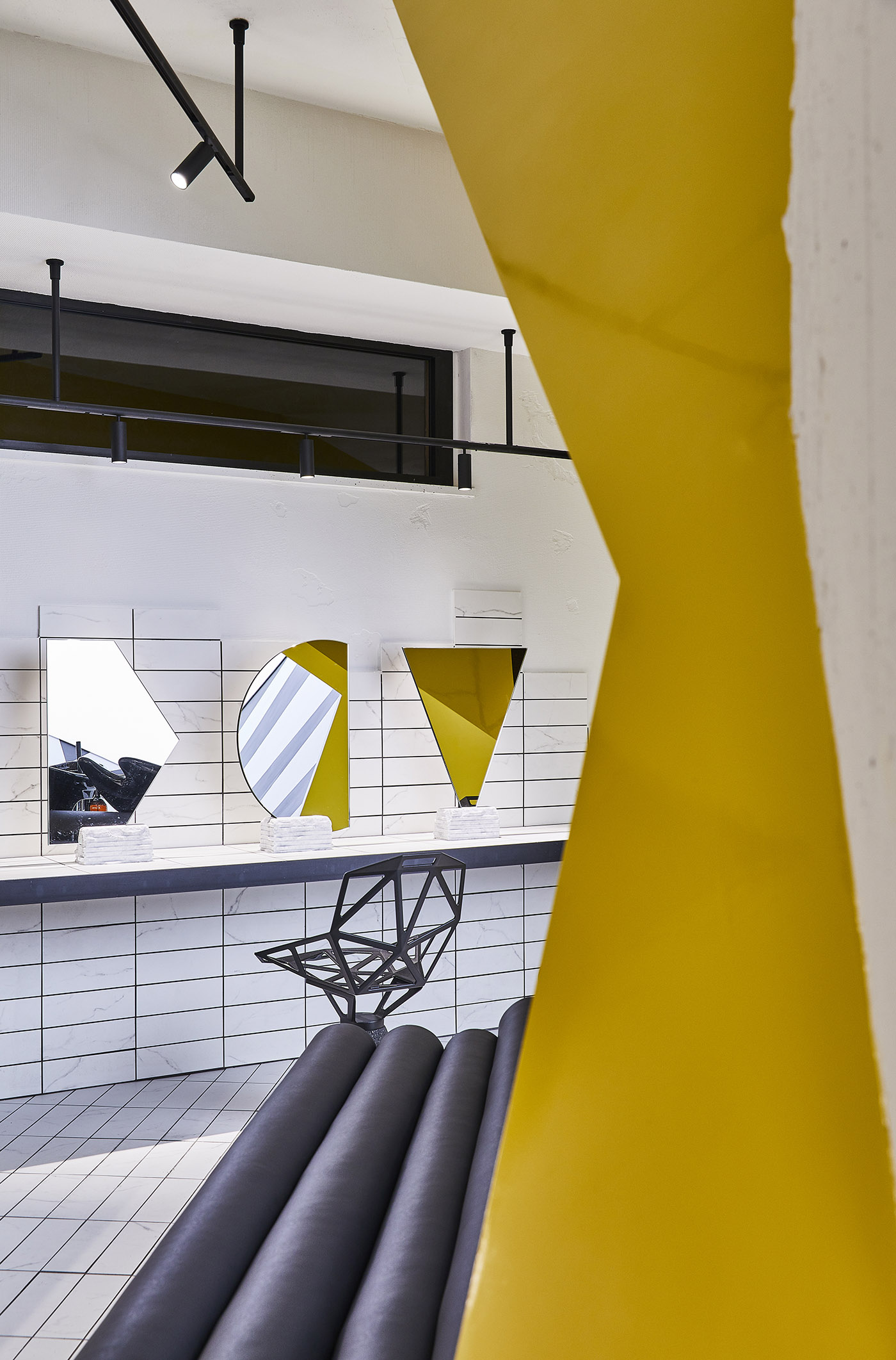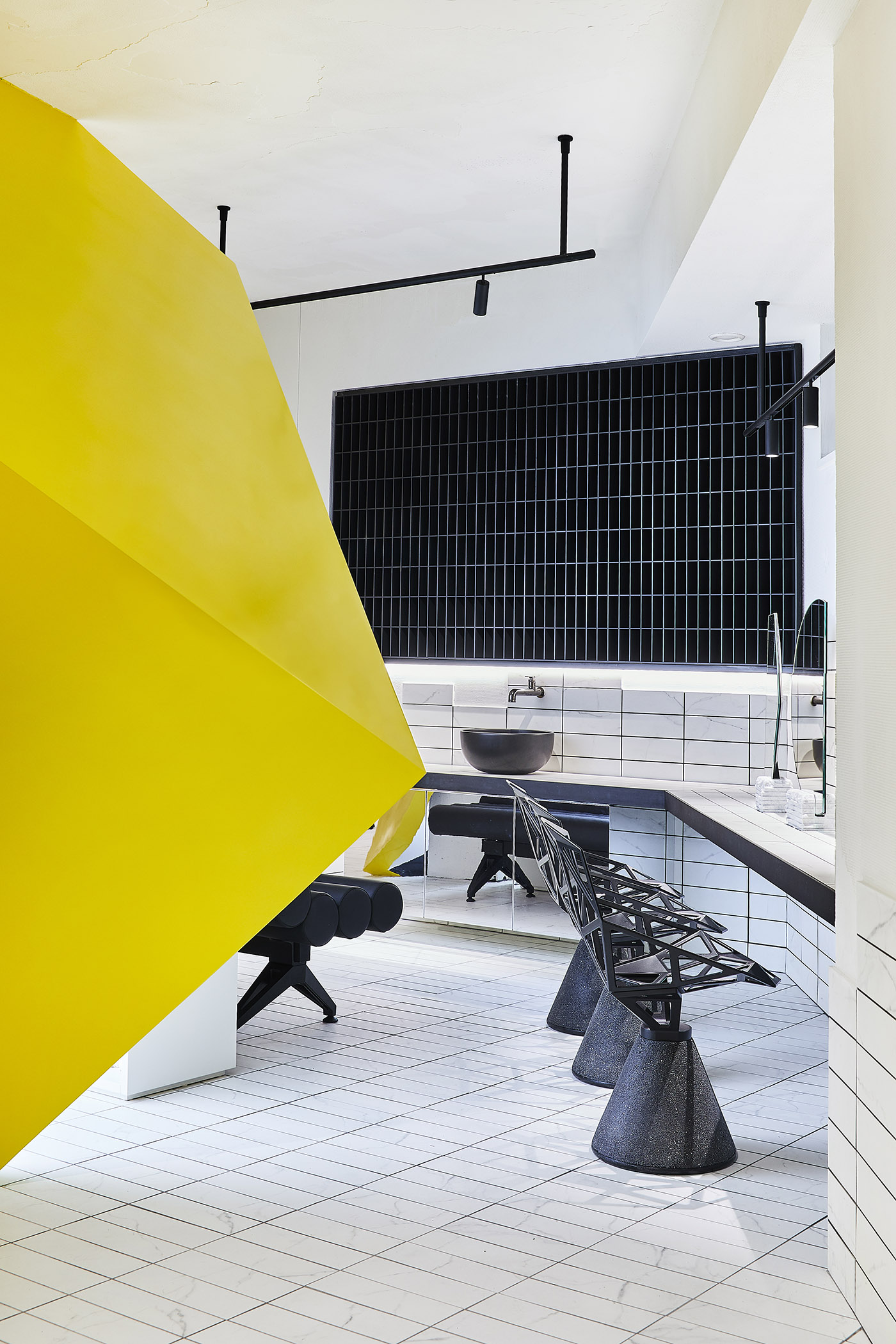 Elemento estructural y protagonista indiscutible del espacio, el color sólido y soleado irradia luz y energía al espacio. Todo el entorno es un salón de belleza, donde prevalecen las líneas esenciales y rigurosas y donde los tonos fríos del blanco y el negro crean un contraste fuerte pero bien equilibrado con la calidez del amarillo