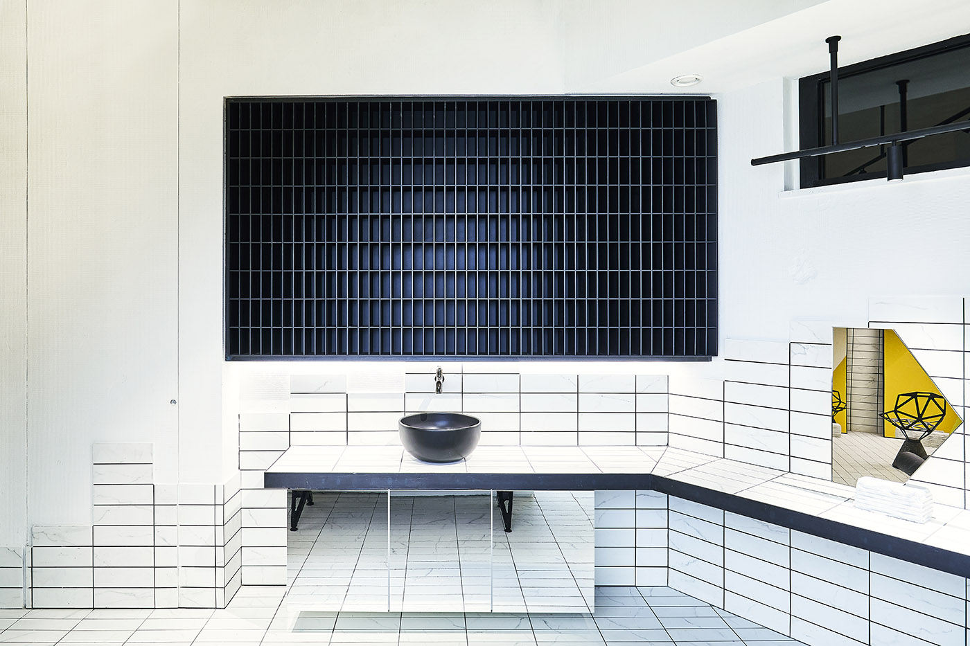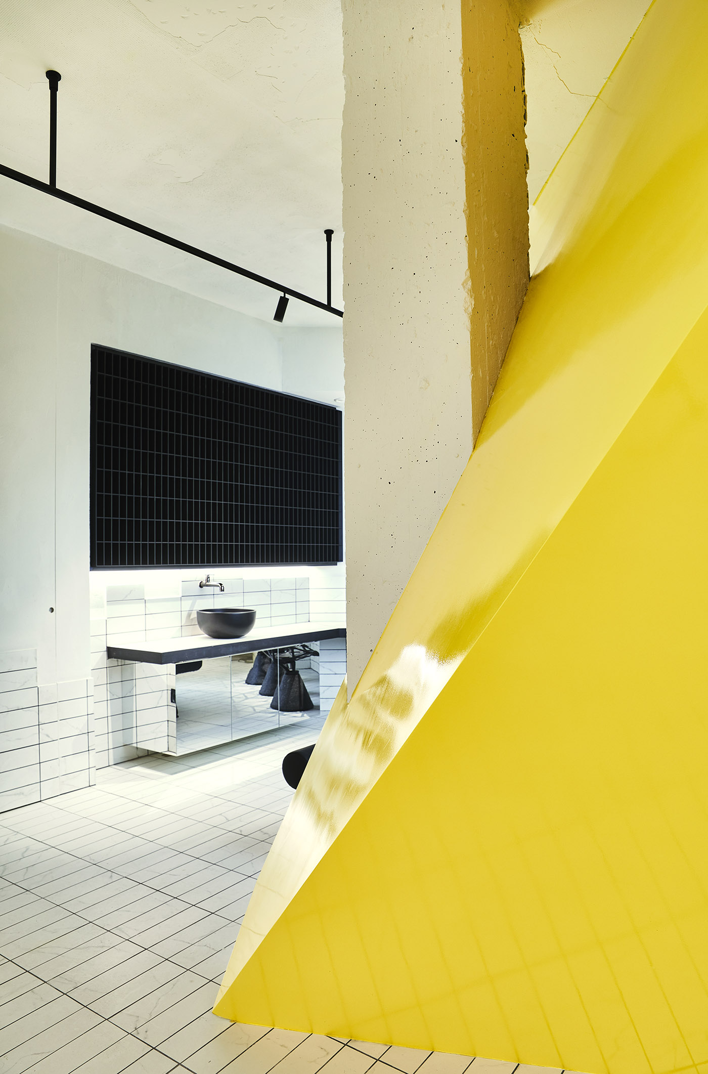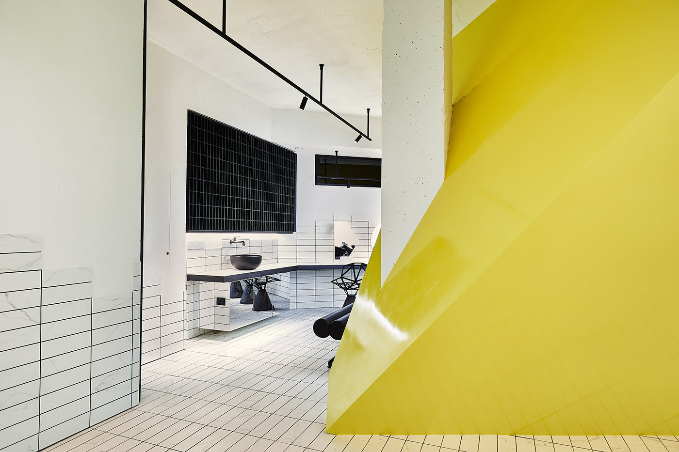 Elemento estructural y protagonista indiscutible del espacio, el color sólido y soleado irradia luz y energía al espacio. Todo el entorno es un salón de belleza, donde prevalecen las líneas esenciales y rigurosas y donde los tonos fríos del blanco y el negro crean un contraste fuerte pero bien equilibrado con la calidez del amarillo