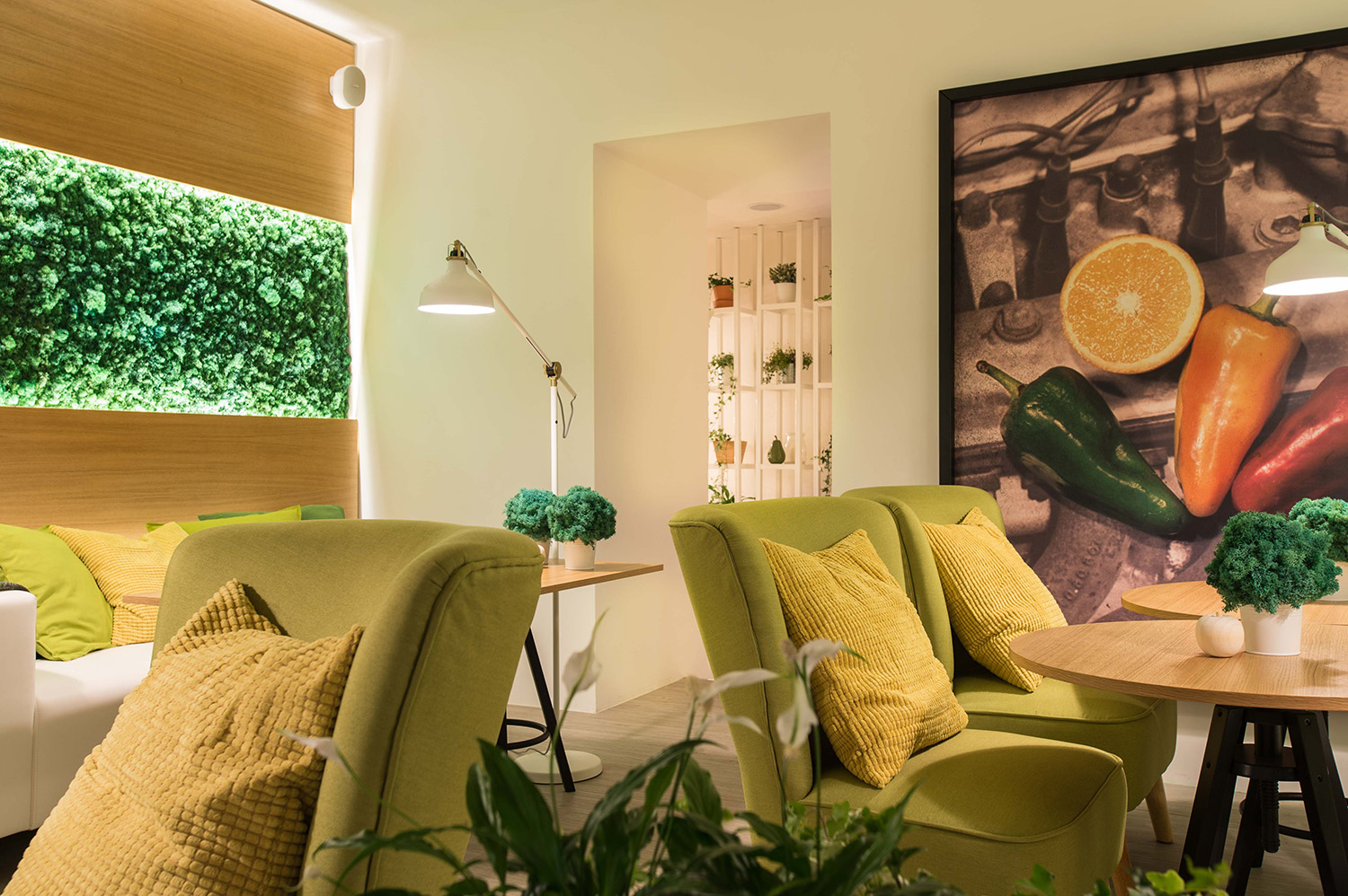 Il locale si sviluppa su due livelli ed è diviso in 3 diversi ambienti all’ingresso troviamo i primi tavoli e un salottino sovrastato da due alberi naturali, con la piccola cucina aperta sulla sala, una zona espositiva e ricca di piante è stata ricavata nello spazio sottostante la scala che porta al secondo ambiente, pensato con ampie poltrone verdi morbide ed avvolgenti e divani bianchi dalle linee più pulite
