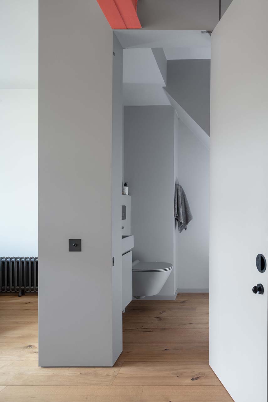 El piso intermedio de la vivienda recibe un tratamiento para ampliar visualmente el limitado espacio disponible. La habitación en el ático se amplía liberando el espacio de viejas particiones redundantes y trasladando su entrada al nivel inferior