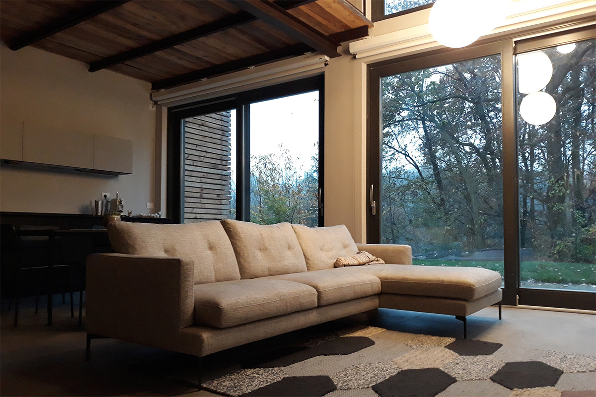 La disposizione degli ambienti è stata dettata dalla grande vetrata a sud che si affaccia sul bosco privato, la bellezza della visuale e della natura circostante ha “imposto” la collocazione su questo fronte della zona soggiorno/cucina conformata in “open space” e della camera padronale.
