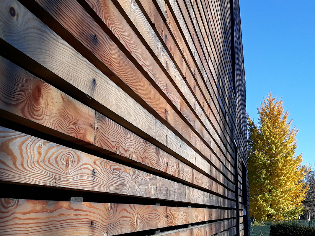 Particolare cura è stata posta nello studio della facciata ventilata (di cui abbiamo fatto cenno sopra) con la simulazione di diverse essenze lignee che hanno portato alla scelta di utilizzare listelli di larice non trattati di sezione 3x7 cm, posati in orizzontale con un interspazio di 2,5cm sulle pareti in blocchi di cls cellulare da 40 cm. La scelta del legno in facciata è dovuta anche all’attenzione del progettista per l’inserimento nel contesto ambientale, la casa infatti “invecchiando” tenderà sempre più a mimetizzarsi con il bosco.