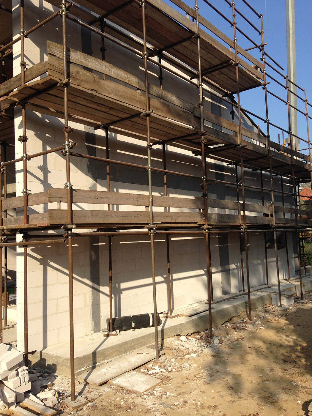 La scelta di utilizzare Gasbeton (distribuito in Italia da Bacchi) e l’accurata progettazione architettonica di Paolo Chiappero sono state fondamentali per raggiungere un’ elevata prestazione energetica sia estiva che invernale determinando una classe energetica globale A1. Le murature esterne infatti sono state realizzate con blocchi GASBETON® ACTIVE sp. 40 cm, successivamente rasate con INCOLLARASA, protette da un telo impermeabile traspirante e infine rivestite con doghe orizzontali di legno fissate su una sottostruttura ancorata alla muratura con tasselli specifici per GASBETON®. Le tramezze sono state realizzate con blocchi GASBETON® EVOLUTION rasate con INCOLLARASA armata con rete in fibra di vetro.