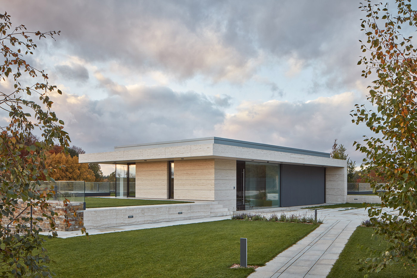 El material principal de la Villa en Vlastibořice es la piedra, que domina el exterior con grandes baldosas de piedra vista. El jardín, igualmente importante, está diseñado como un parque paisajístico y consta de varias partes: cerca de la entrada es más formal, mientras que hacia el sur se divide en imaginativas terrazas que fluyen libremente en el paisaje