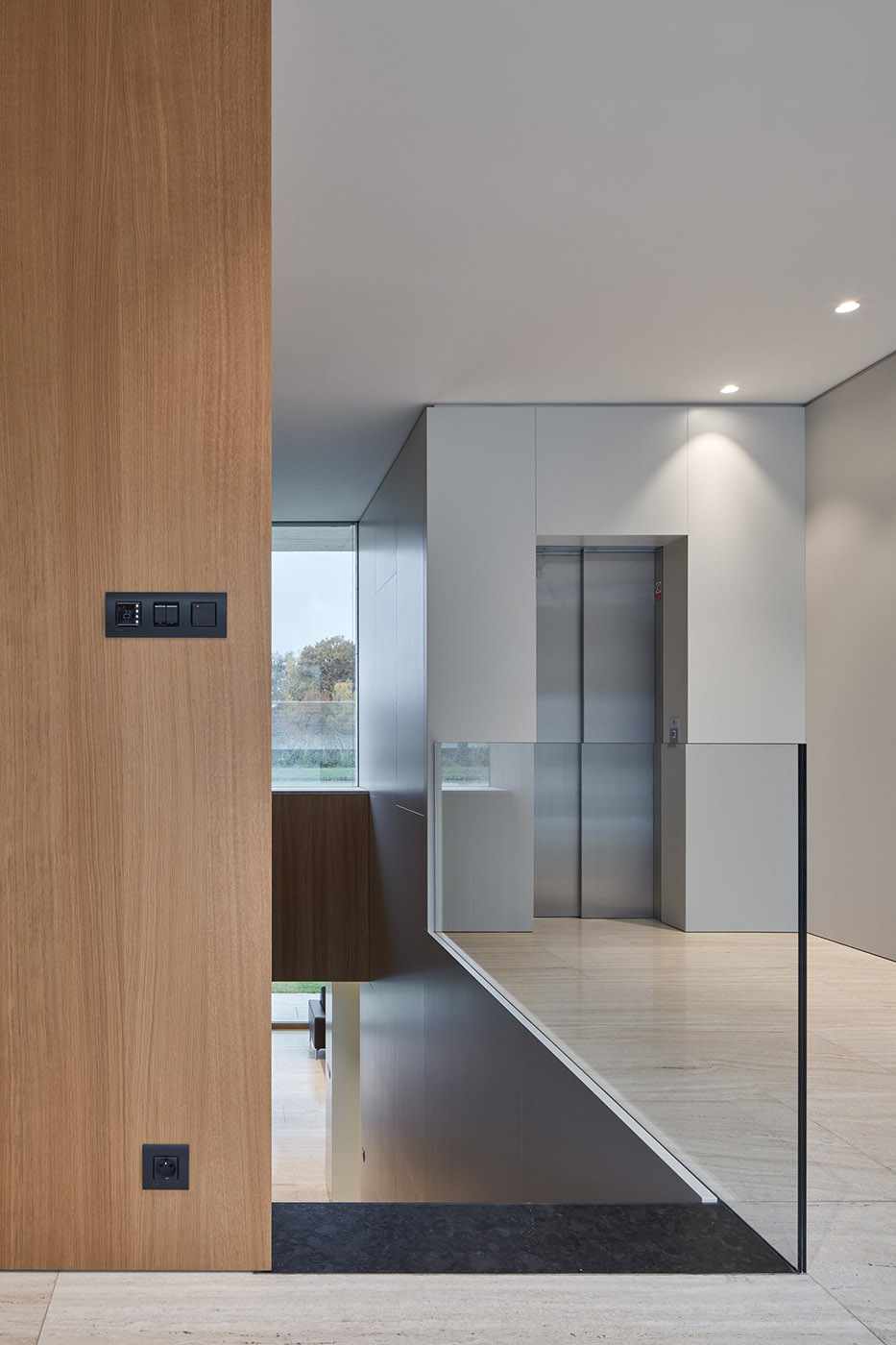 Espacios sencillos y limpios, que aprovechaban al máximo los materiales naturales. Un chalet de dos plantas, revestido de piedra, en cuya planta superior se encuentran las habitaciones de los huéspedes con entradas separadas y un estudio, y en la planta inferior, ligeramente empotrada en el suelo, el espacio vital principal, con garaje y piscina