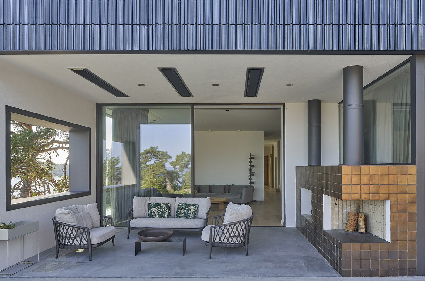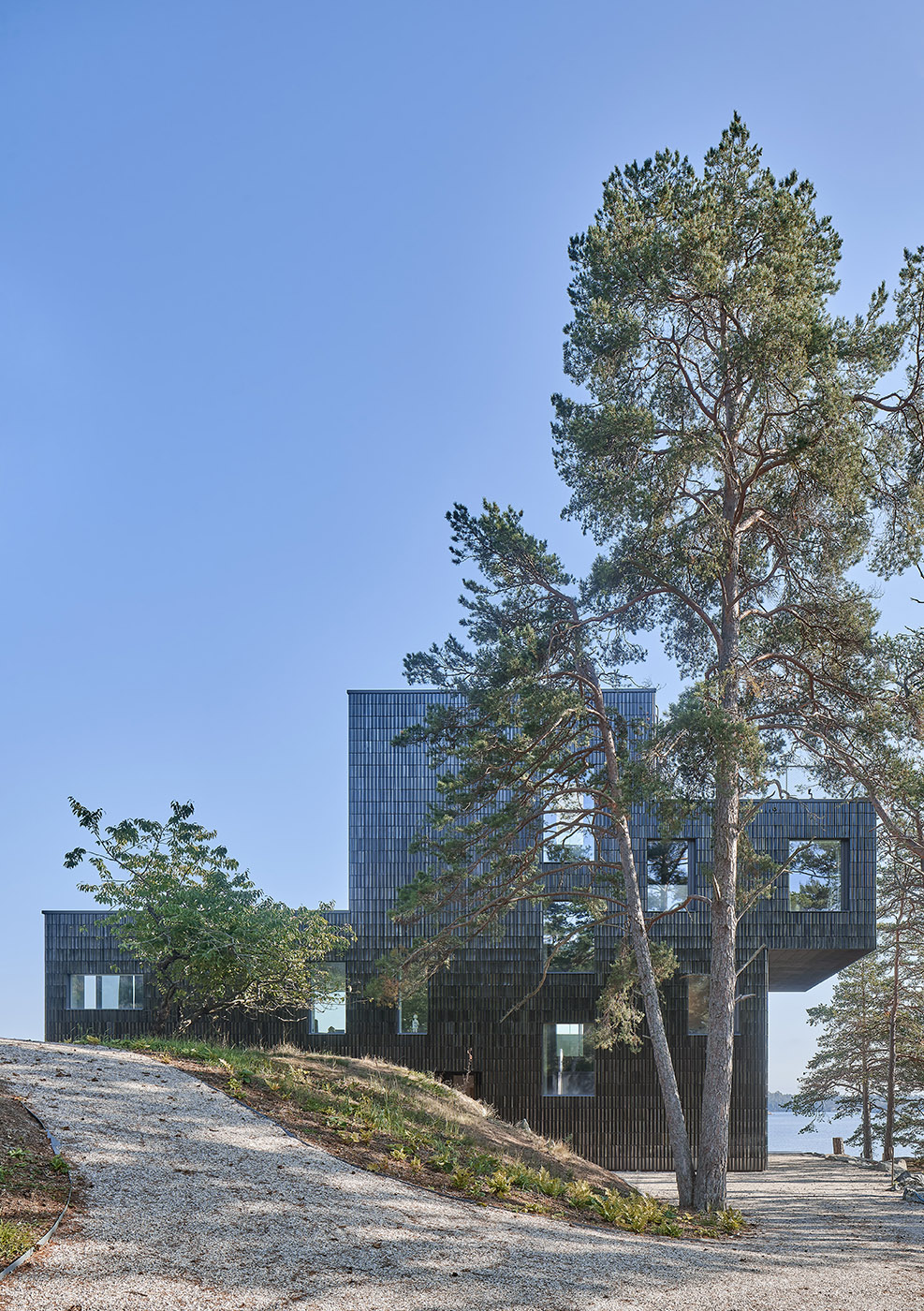 Amplios acantilados y mar abierto hacia el horizonte: el punto de partida para la construcción de una casa privada en Djurö, Villa Sagalid, cuyo revestimiento cerámico se inspira en el color y la textura de la corteza de los pinos que la rodean