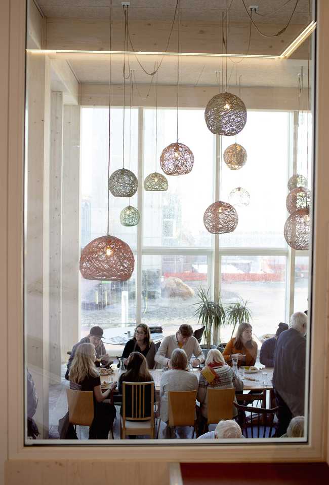 Se accede al edificio a través de un patio situado en un amplio pasillo de doble altura repleto de plantas verdes. Además, cuenta con un comedor, talleres, habitaciones y un salón. Todo está construido en madera de abeto con aislamiento de cáñamo, lo que crea un ambiente cálido y tranquilo
