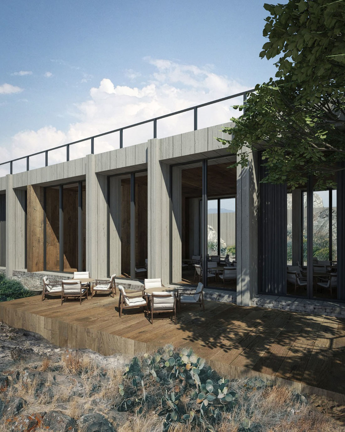 La intención del proyecto era desarrollar una estética para integrar la arquitectura con los elementos existentes. ASP logró esta visión integrando cada volumen en el paisaje, utilizando plataformas horizontales de hormigón y piedra para impedir la visión hacia el interior desde cualquier espacio. Los materiales utilizados, entre los cuales piedra, madera, tierra y grava, actúan como elementos unificadores gracias a sus colores neutros.