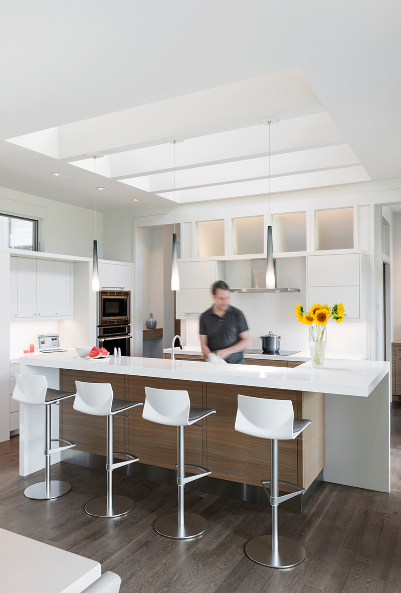 Hay un gran hall en el medio de esta casa. La gran pared de la ventana proporciona una magnífica vista, creando una fuerte conexión con el exterior. Los materiales blancos se utilizan en todo el espacio de la cocina para crear una sensación de separación y contraste. El techo de cascada asimétrico sirve como un punto focal para la cocina. La mesa de comedor de hormigón hecha a medida está alineada con una chimenea en una posición única