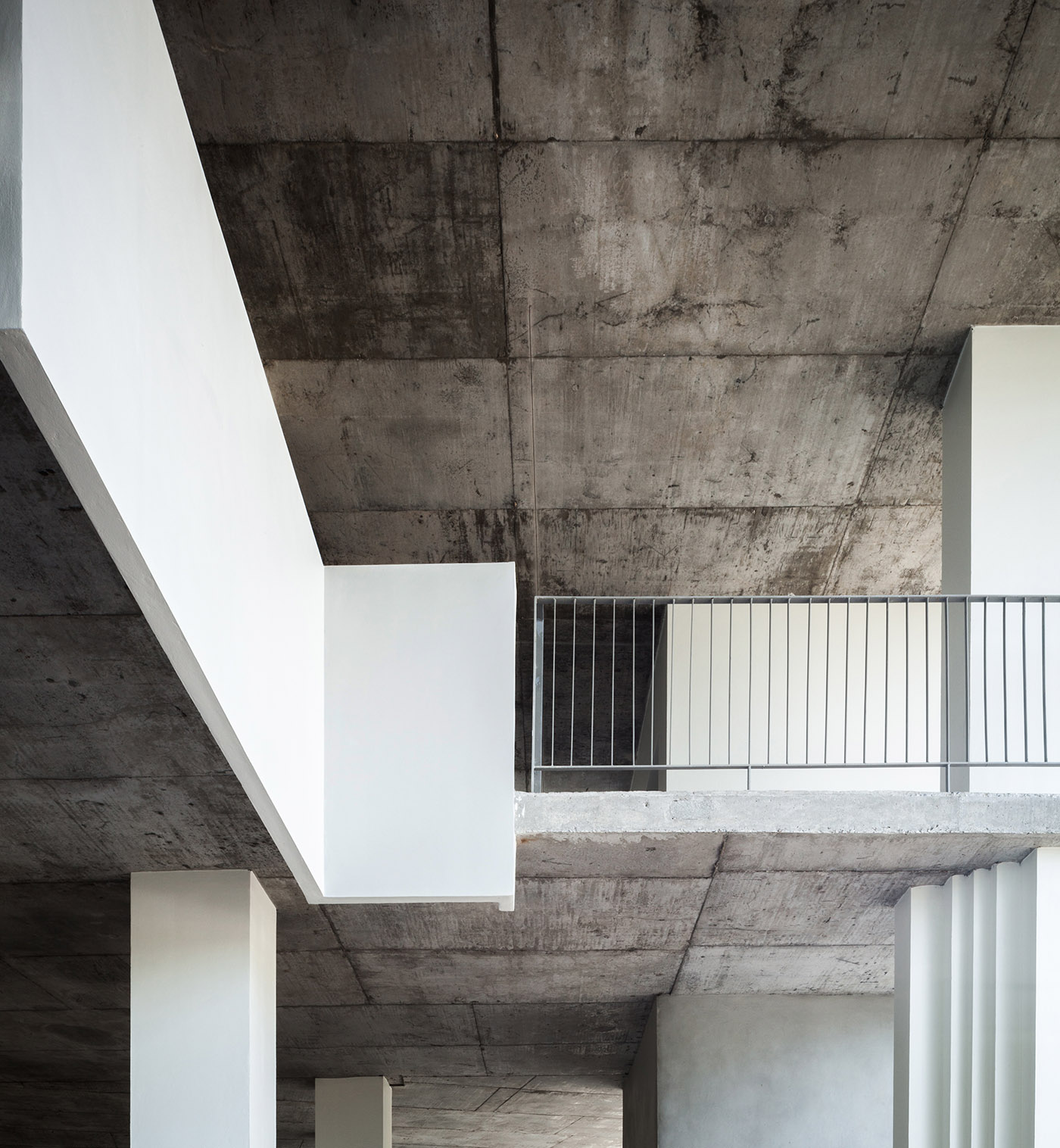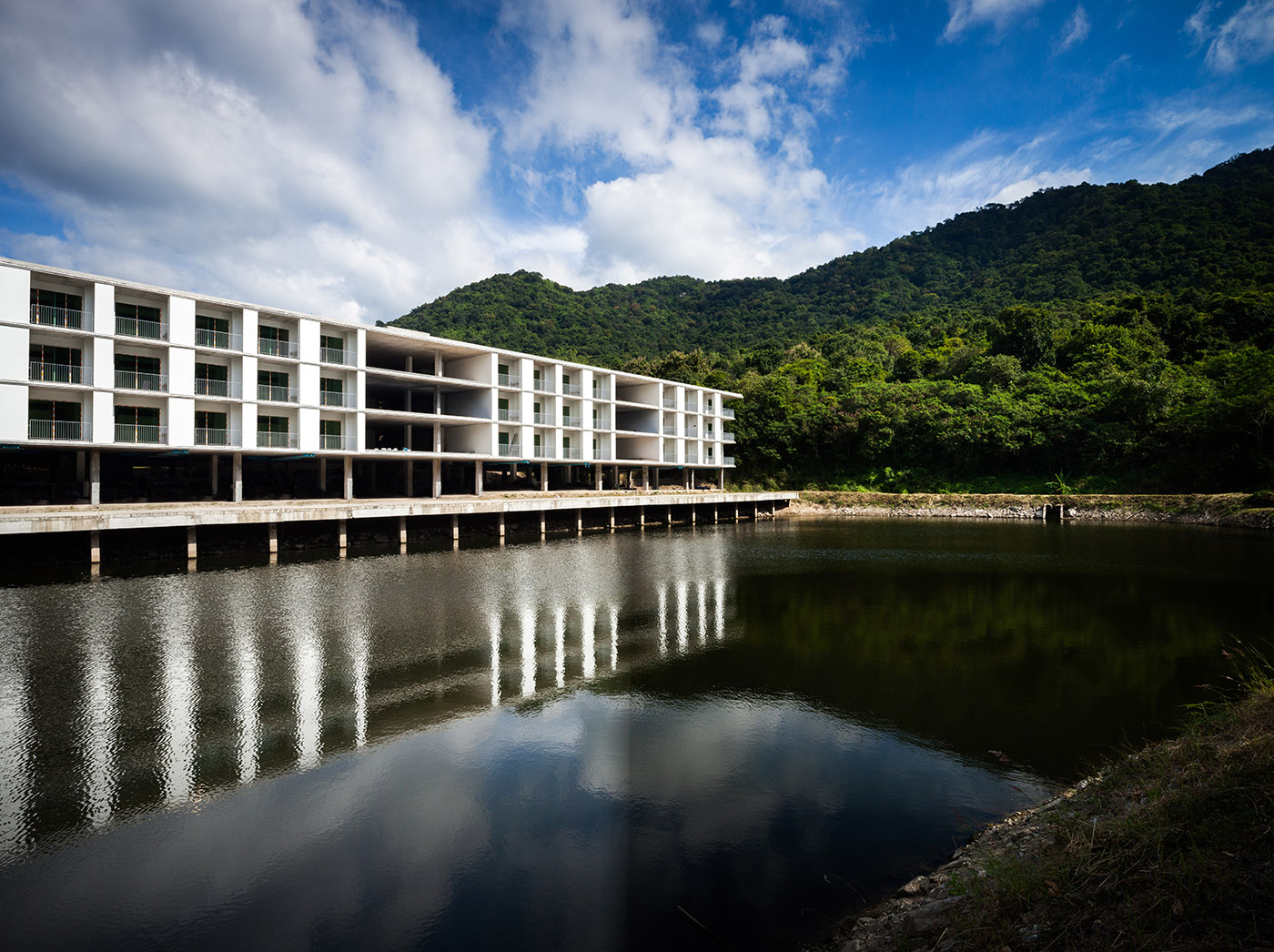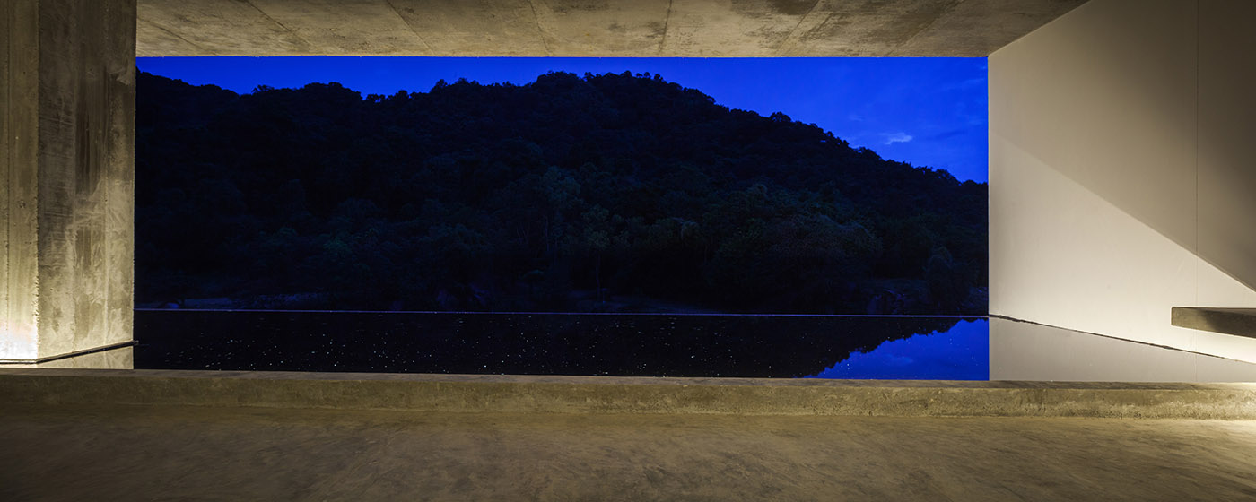 El pasillo simétrico al aire libre cuenta con un pavimento de ladrillos con un patrón inspirado en un venerable templo, en homenaje a la antigua arquitectura tailandesa. Desde la distancia, el edificio se presenta como una caja blanca incrustada en la montaña, diseñada para que las rocas permanezcan en su lugar original rodeadas por el estanque en el centro de la estructura, para mantener la templanza de la temperatura interior y realzar la presencia estoica de las rocas