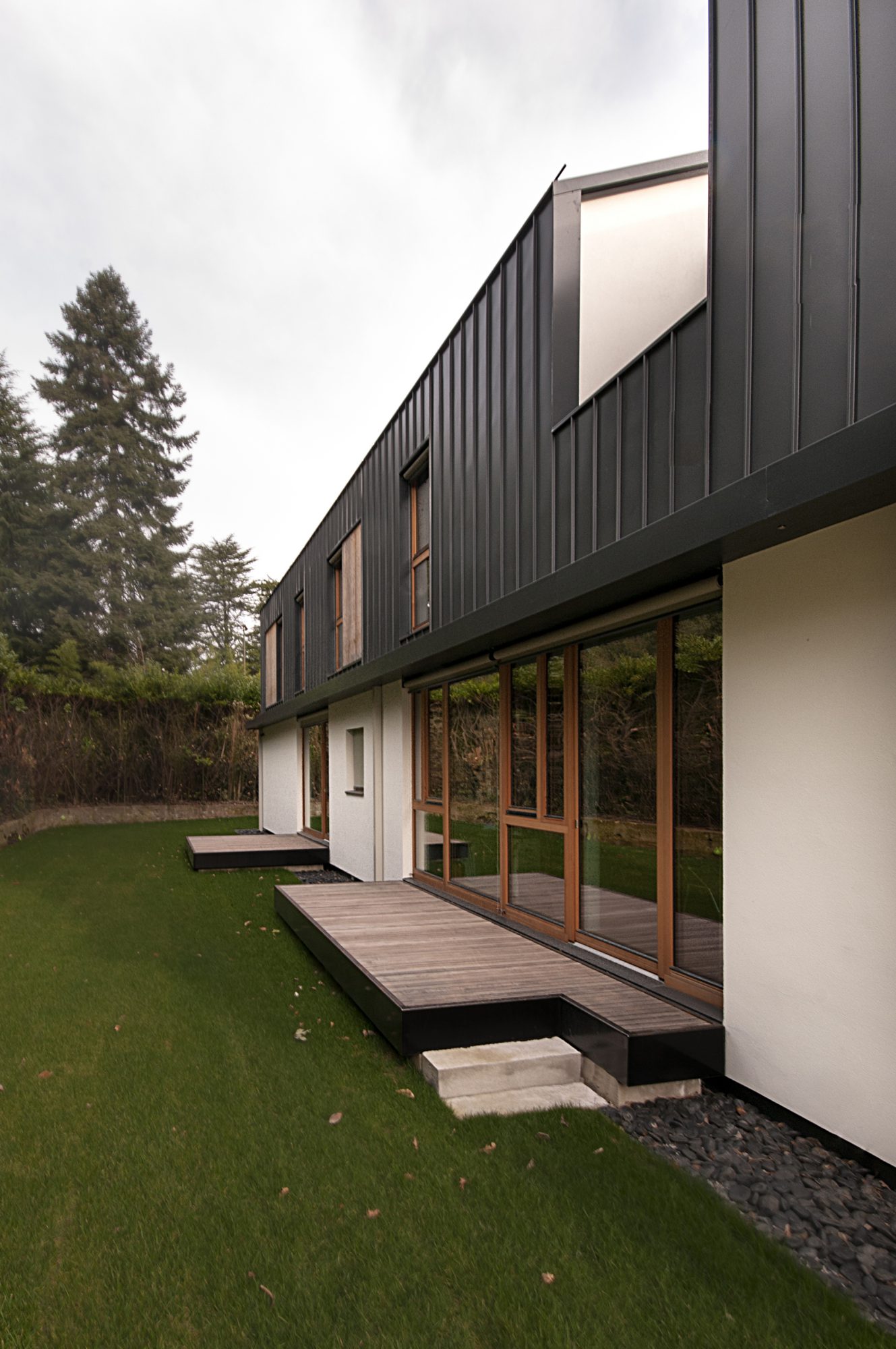 El techo, integrado parcialmente con paneles fotovoltaicos, es a dos aguas y recuerda a las casas sin aleros dibujadas por los niños; el revestimiento del techo es el mismo que el de las paredes verticales del primer piso: es una hoja engrapada de color antracita; de esta manera, el edificio adquiere una apariencia extremadamente contemporánea mientras mantiene su carácter de casa-estudio