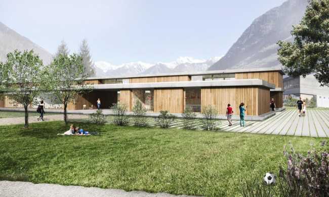La proposta per la nuova Scuola dell’infanzia e per l'ampliamento della Scuola media sono due edifici lineari disposti sull'asse nord-ovest/sud-est; il loro posizionamento gerarchizza gli spazi esterni e ordina i percorsi all'interno dell'intero polo scolastico, formano tra loro un grande vuoto rettilineo, in parte coperto, che collega gli attuali complessi della Scuola Media e della Scuola Elementare