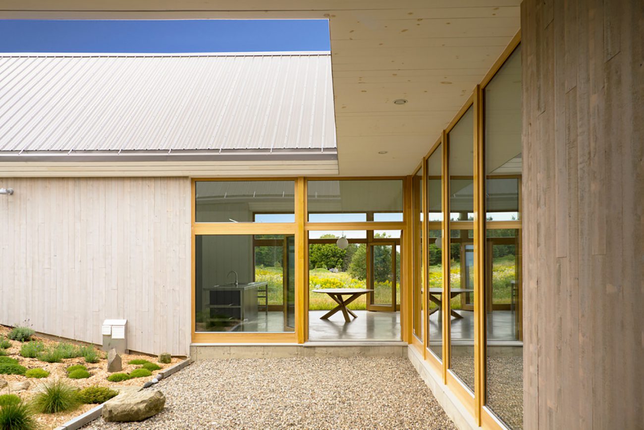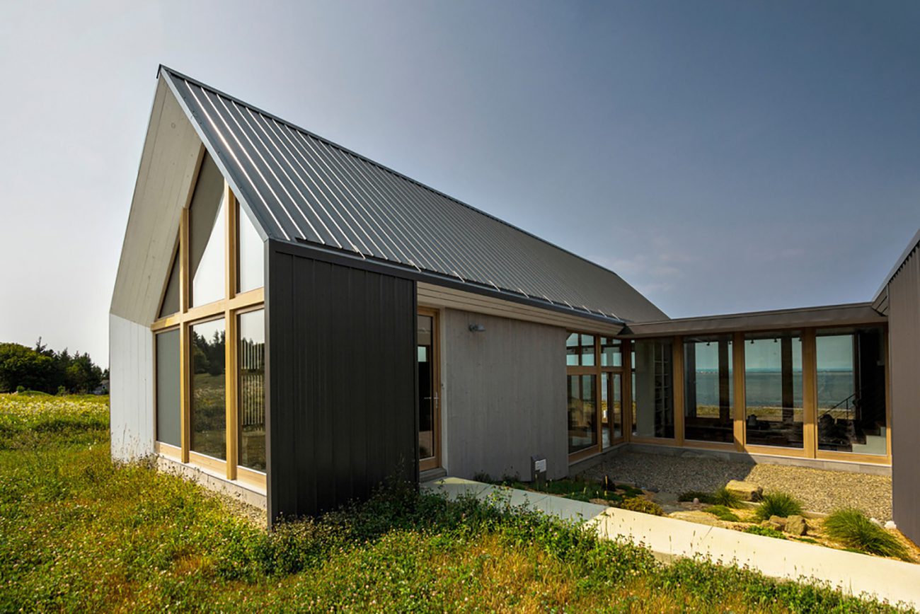 Arquitectura sobria y esencial, inspirada en la arquitectura vernácula acadiana, la casa está compuesta de volúmenes de aspecto gemelo. Los pequeños edificios cubiertos con placas de metal se encuentran en uno de los últimos edificios naturales del pueblo