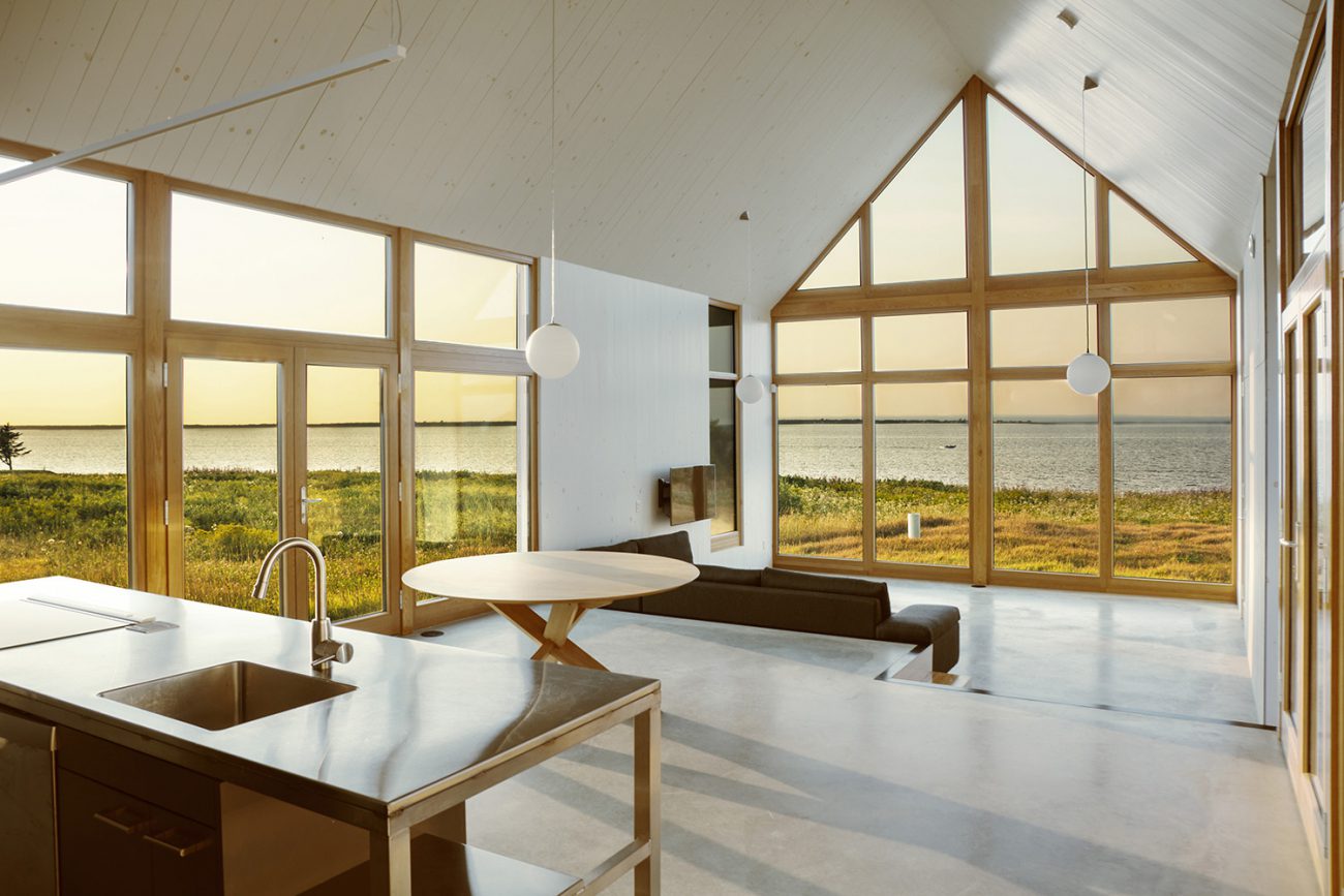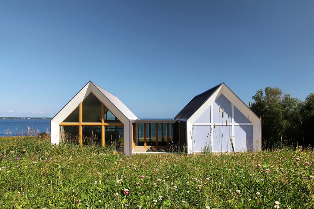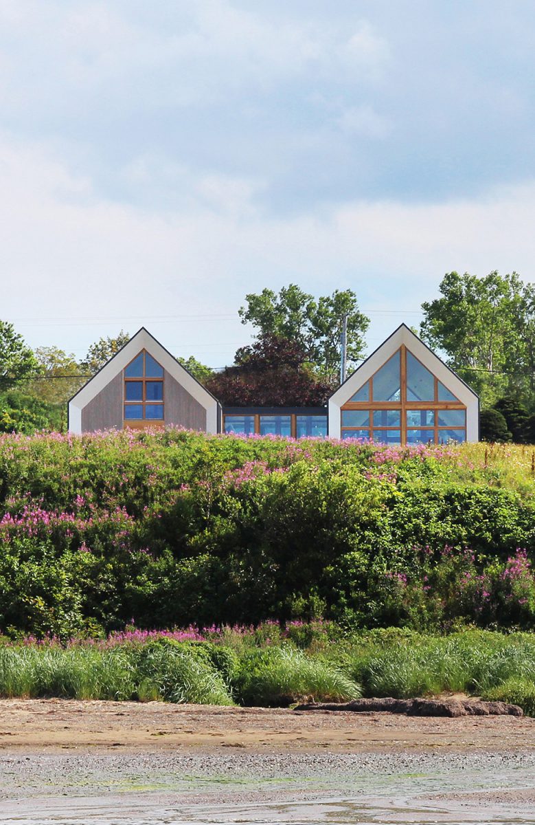 Las casas gemelas, comunes a la arquitectura acadiana, son paralelas entre sí y están conectadas solo por un pasaje acristalado que sirve como espacio de trabajo que ofrece una vista panorámica del mar