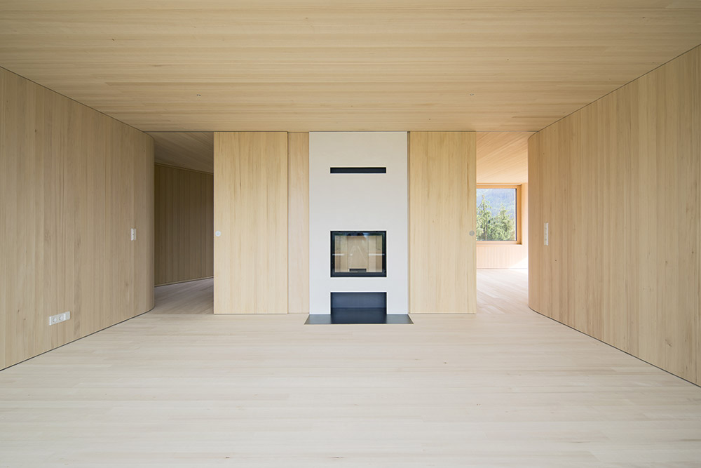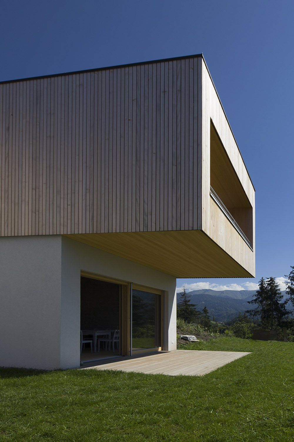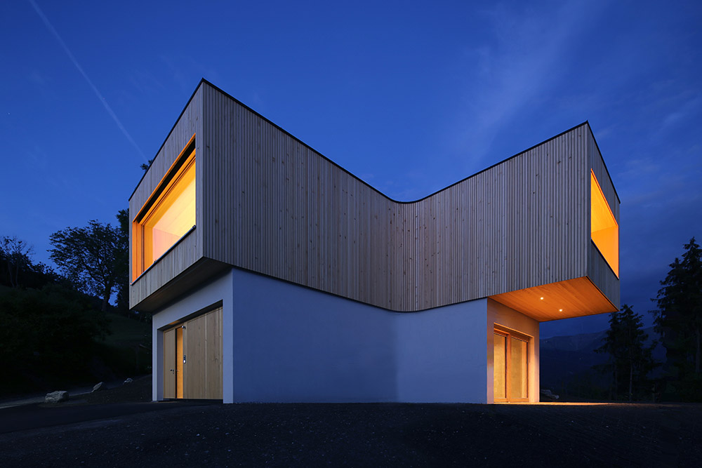 En una pequeña propiedad situada en una colina cerca de Dornbirn, pequeña ciudad austriaca, Juri Troy Architects ha diseñado un edificio orientado hacia los tres principales miradores: el Säntis, el Bondensee y el Primo