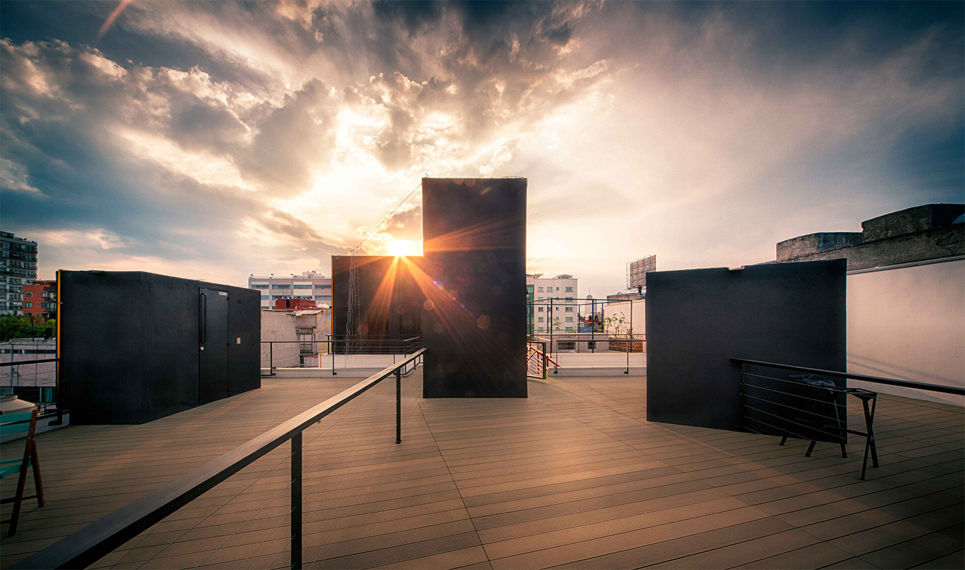 Studio Edaa interpreta un edificio multifamiliar en la Ciudad de México, que combina arquitectura contemporánea y revestimientos brillantes: una fachada cuadrada de color negro que se integra con el contexto.