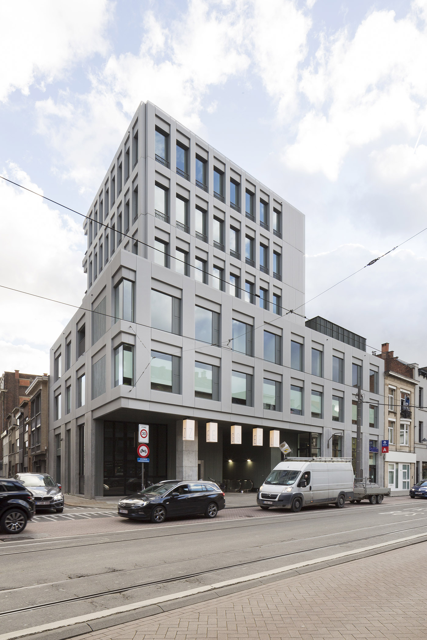 El edificio Zegel, en la esquina de importantes vías de acceso a la ciudad de Amberes, se ha construido para albergar un conjunto de oficinas de la policía municipal, viviendas y la entrada a una estación de metro