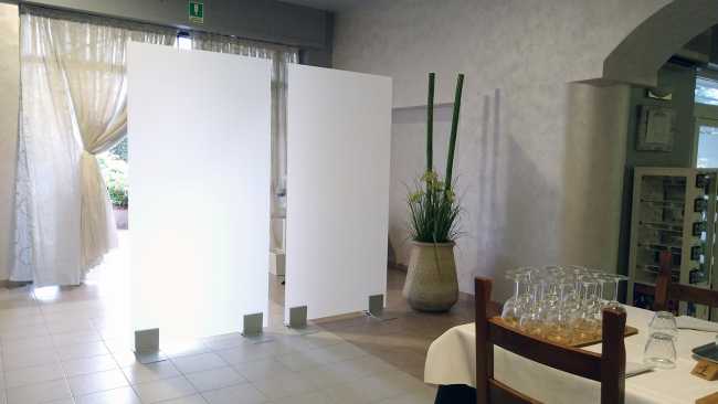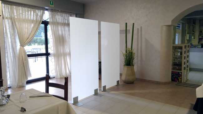Safe WALL è disponibile in due altezze con le stesse caratteristiche di personalizzazione della versione DESK, come le colorazioni opache o trasparenti, a seconda del grado di privacy desiderato. Si posiziona in semplice appoggio a terra senza l’utilizzo di viti o altro sistema di fissaggio, grazie a alla presenza di basi dimensionate per rendere il sistema autoportante