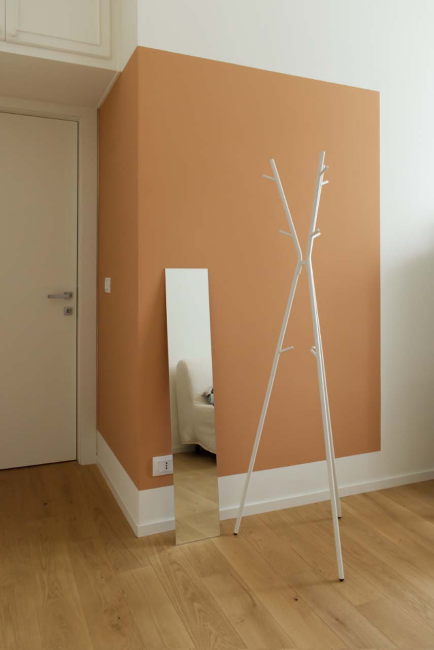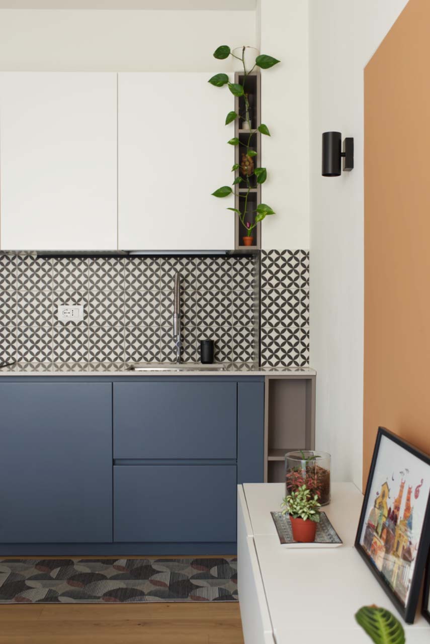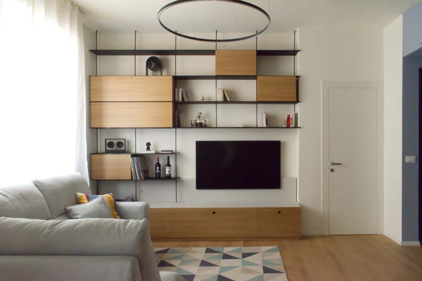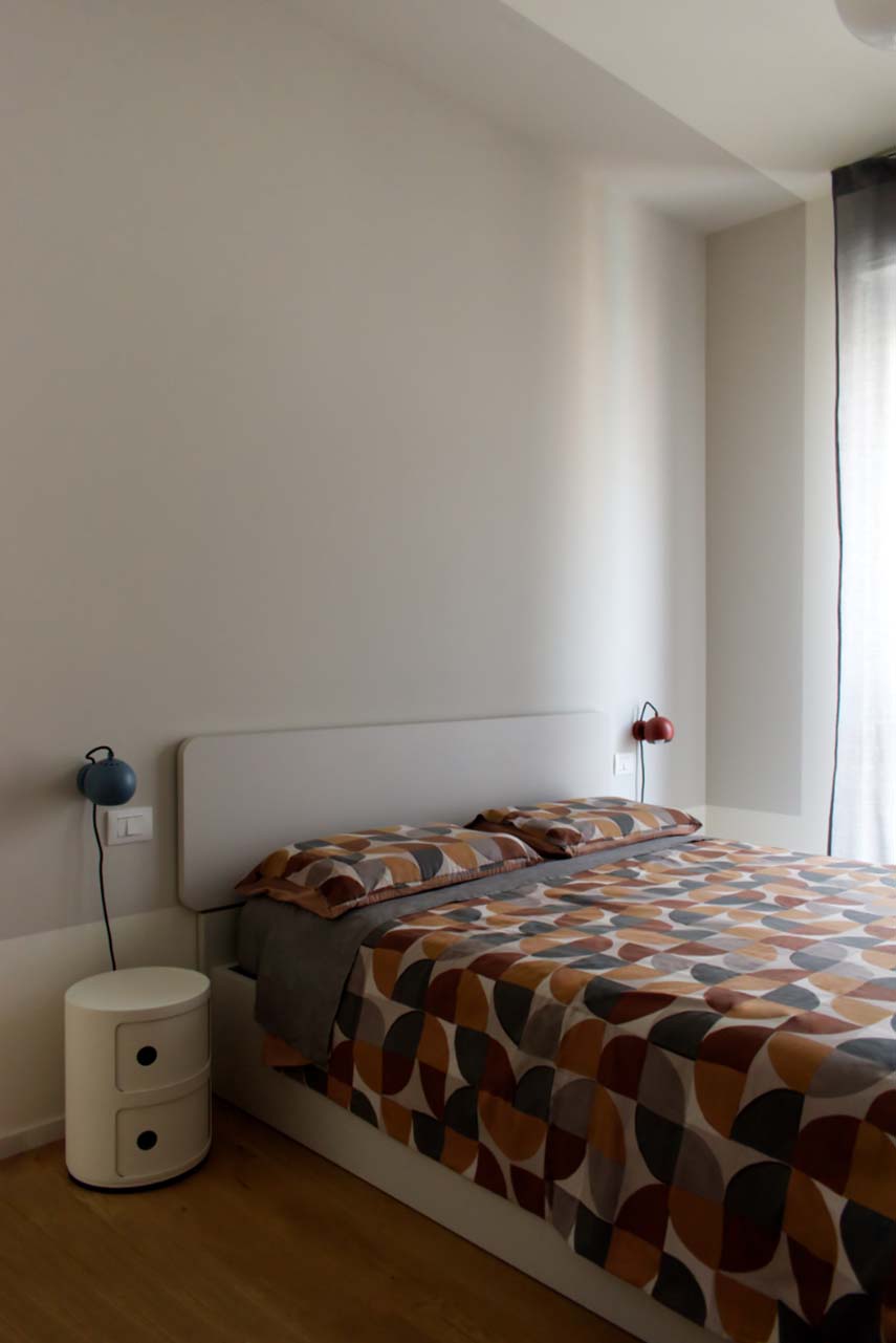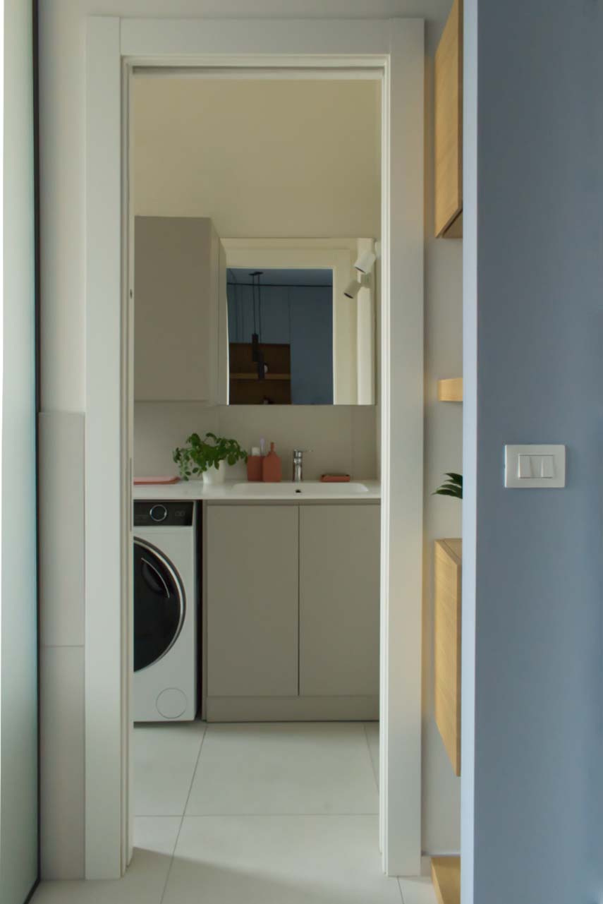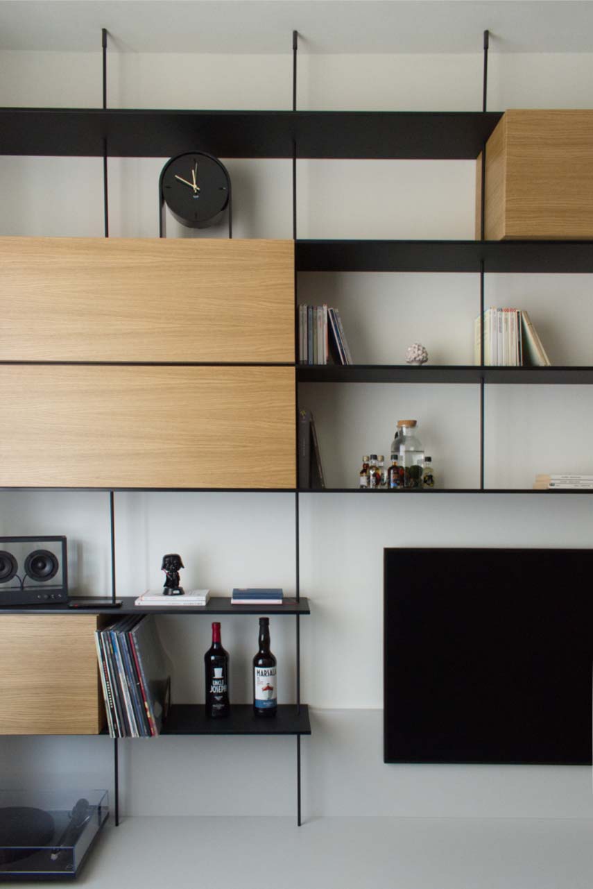 El apartamento se distribuye en sus 90 metros cuadrados con un programa compuesto por un volumen rebajado que sirve como entrada y se abre al salón con zona de estudio; desde aquí una doble puerta corredera acristalada, con elegantes perfiles negros que hacen eco al mueble de TV/biblioteca de la sala de estar, se abre a la espaciosa cocina. El dormitorio principal y el baño principal completan la casa junto con el baño de servicio y el segundo dormitorio