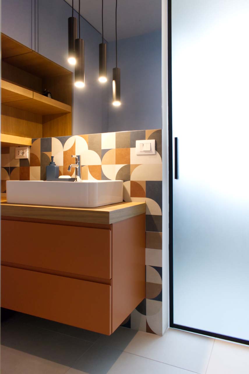 Las dos personalidades de los clientes también se expresan a través de la preferencia por los tonos fríos de azul de uno y los tonos terrosos como el terracota y los colores cálidos del otro. Con el apoyo de un diseño estudiado a medida, estas preferencias aparentemente difíciles de hacer coexistir crean dinamismo y originalidad en el ambiente