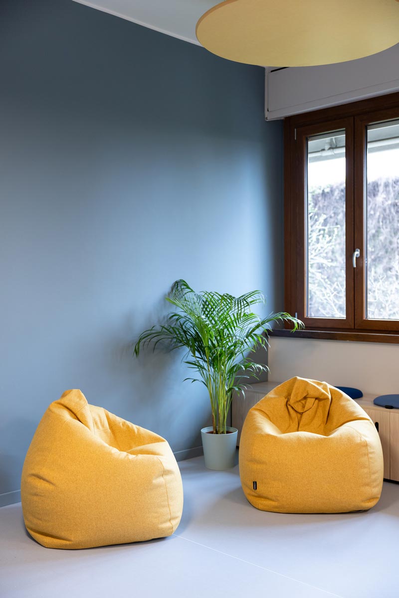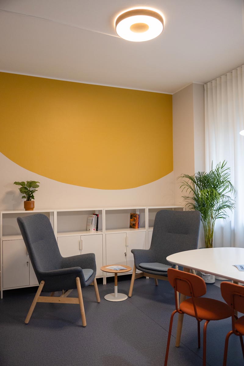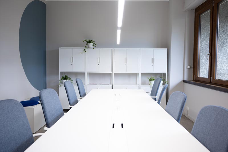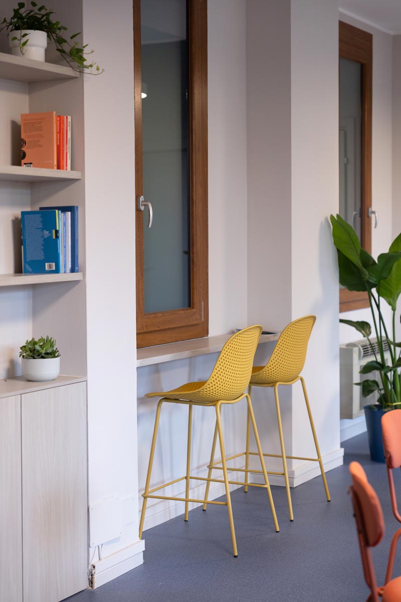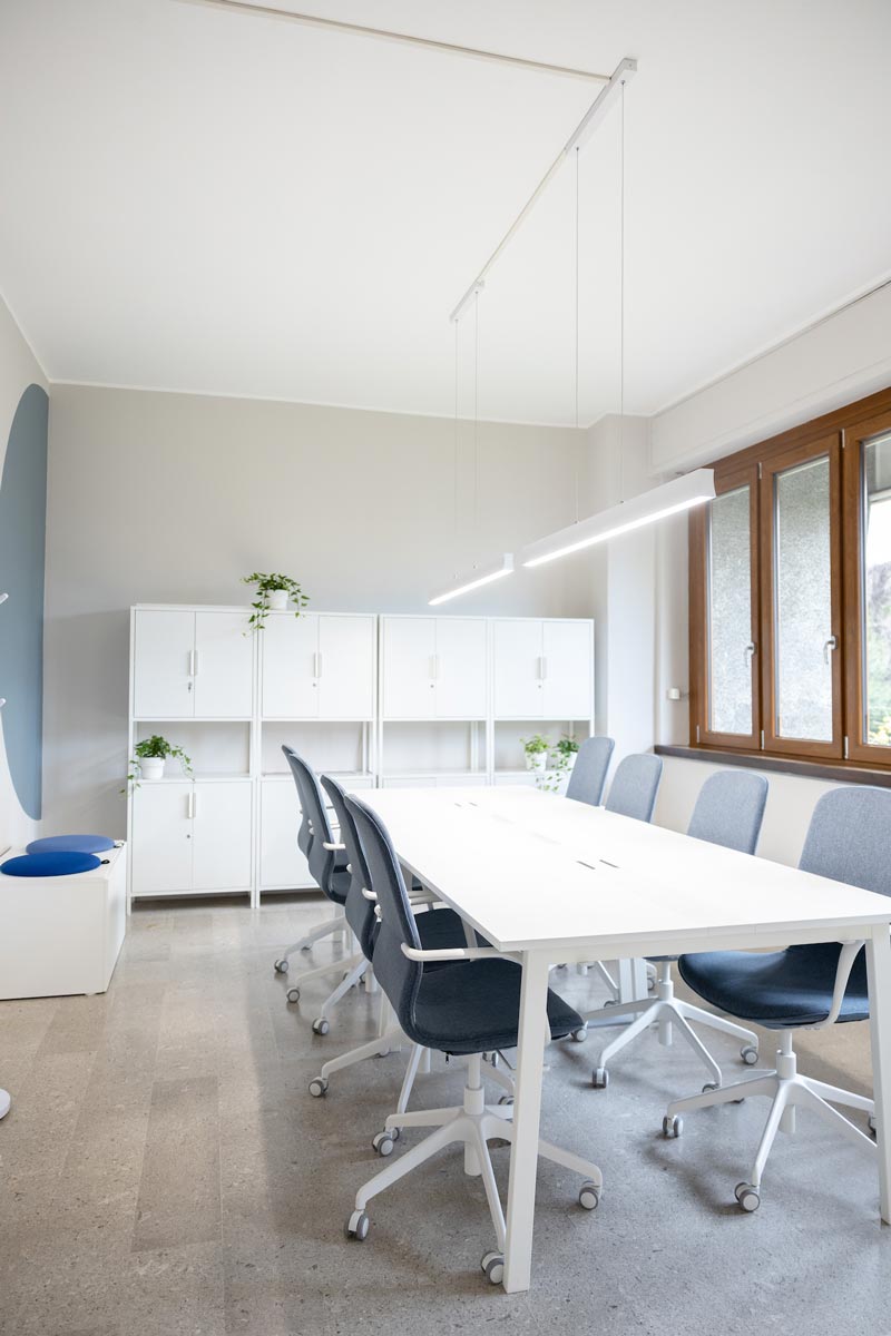 Las particiones son modulares y removibles, permitiendo reconfigurar el espacio según las necesidades operativas o eventos. Un elemento distintivo del edificio original, un bow window en cuarto de esfera, ha sido reinterpretado en el diseño a través de la creación de una sala privada semiesférica, lograda replicando la misma geometría en paredes y techo en posición especular.