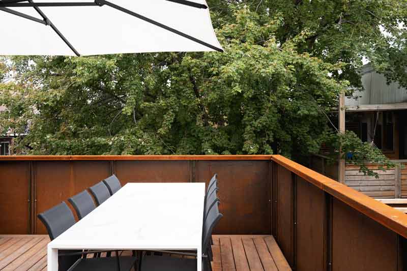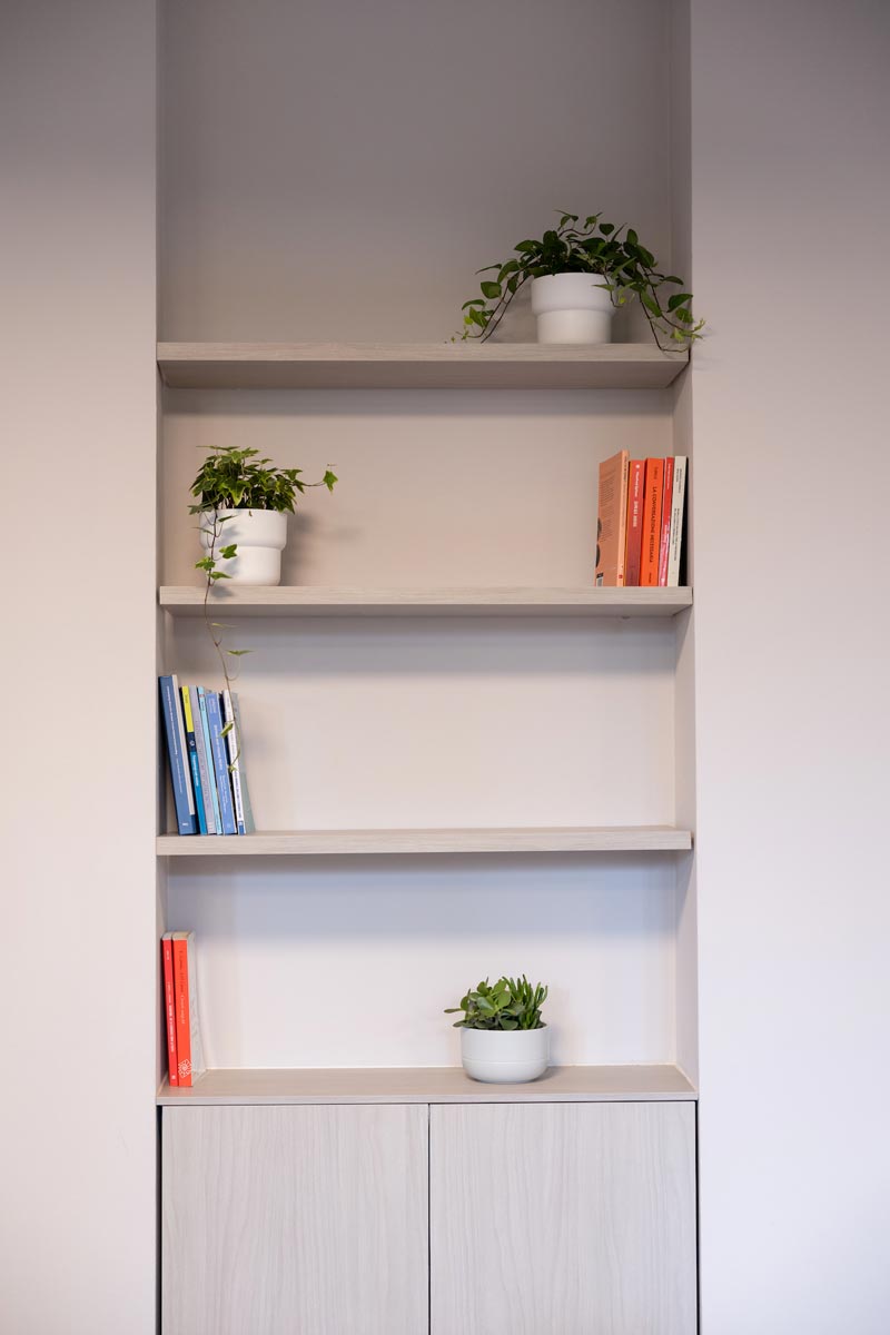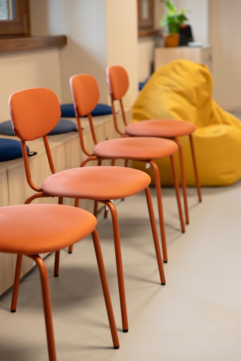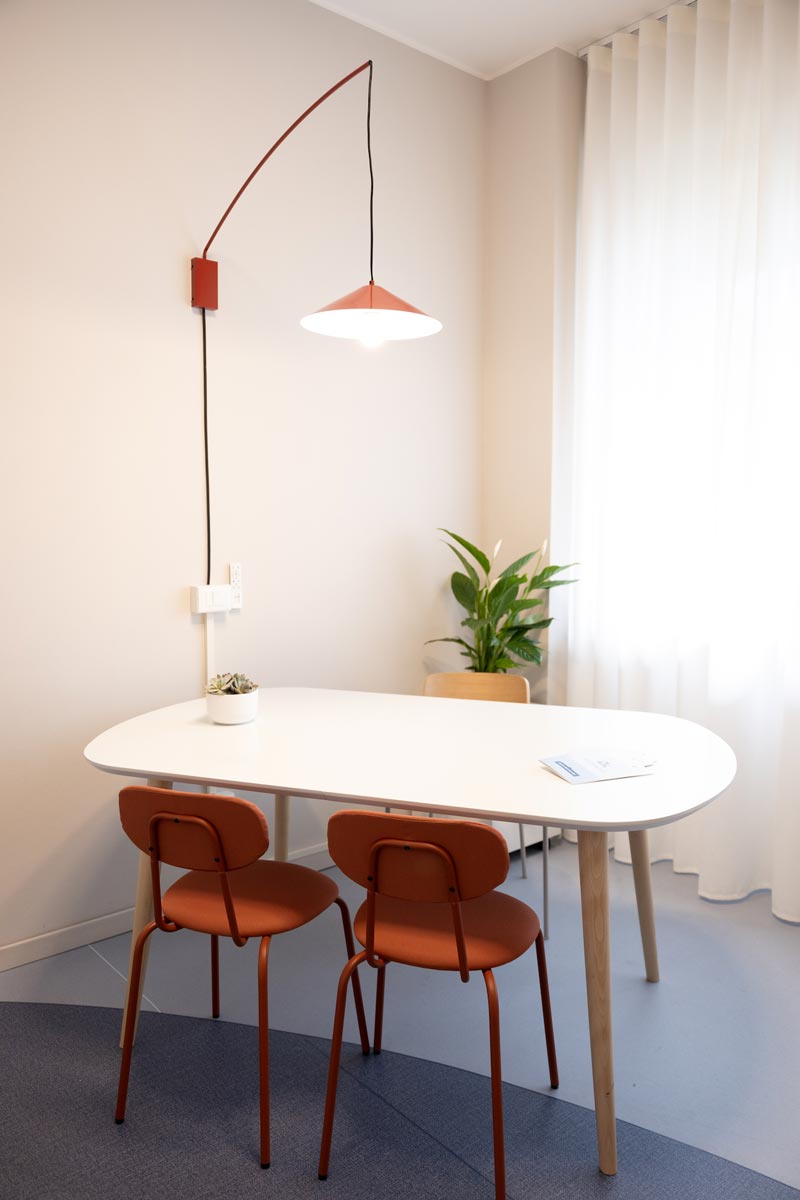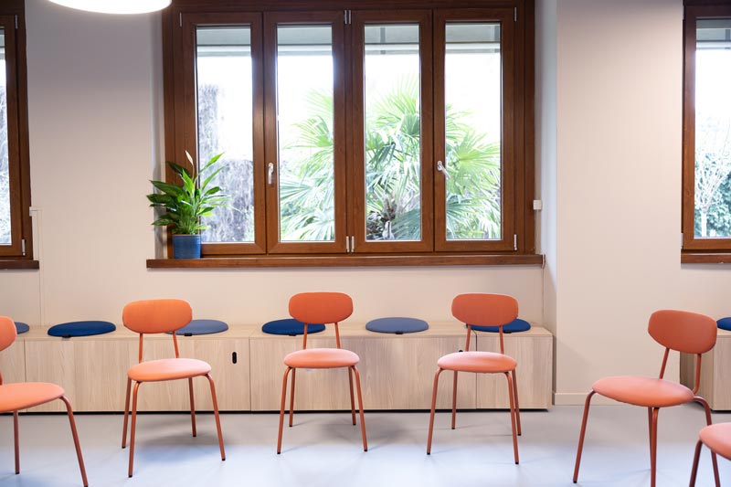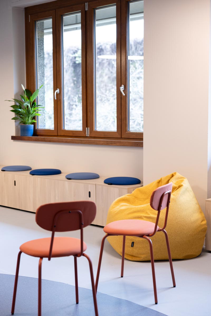 Las particiones son modulares y removibles, permitiendo reconfigurar el espacio según las necesidades operativas o eventos. Un elemento distintivo del edificio original, un bow window en cuarto de esfera, ha sido reinterpretado en el diseño a través de la creación de una sala privada semiesférica, lograda replicando la misma geometría en paredes y techo en posición especular.