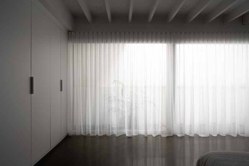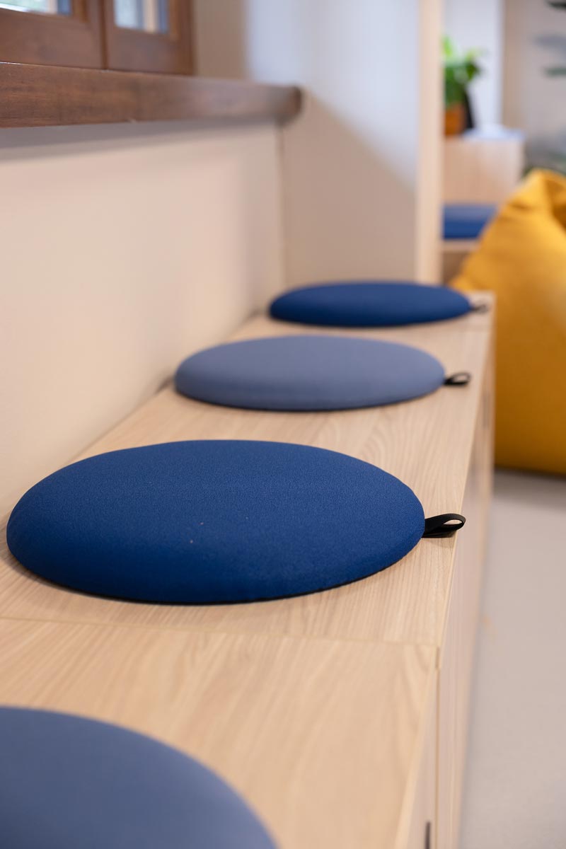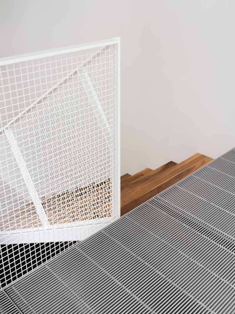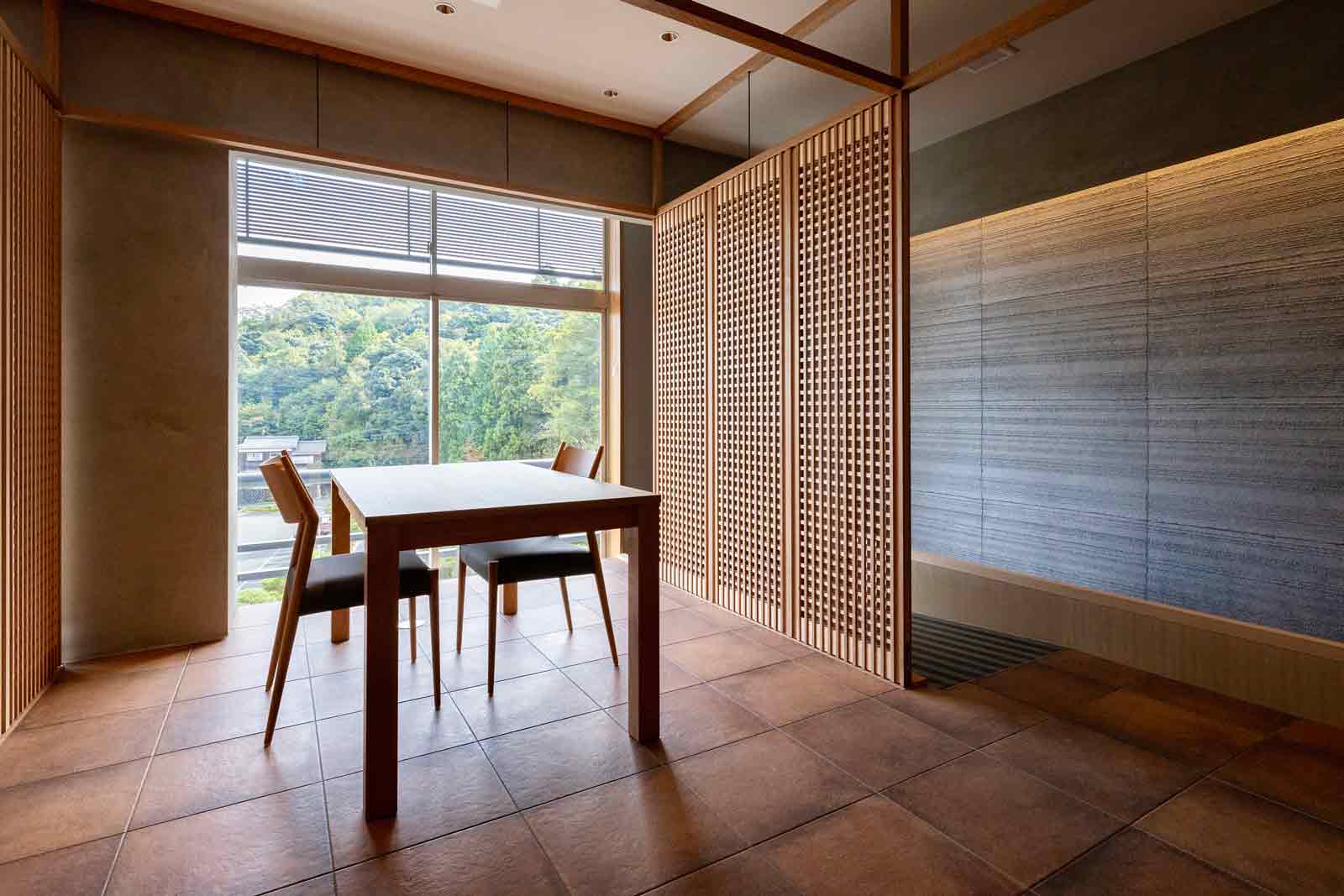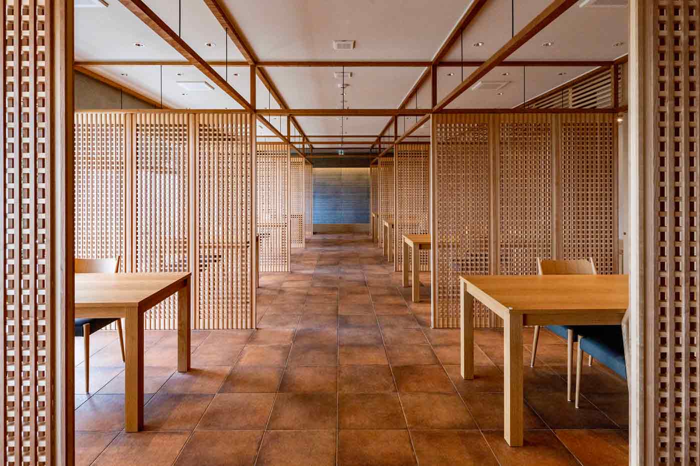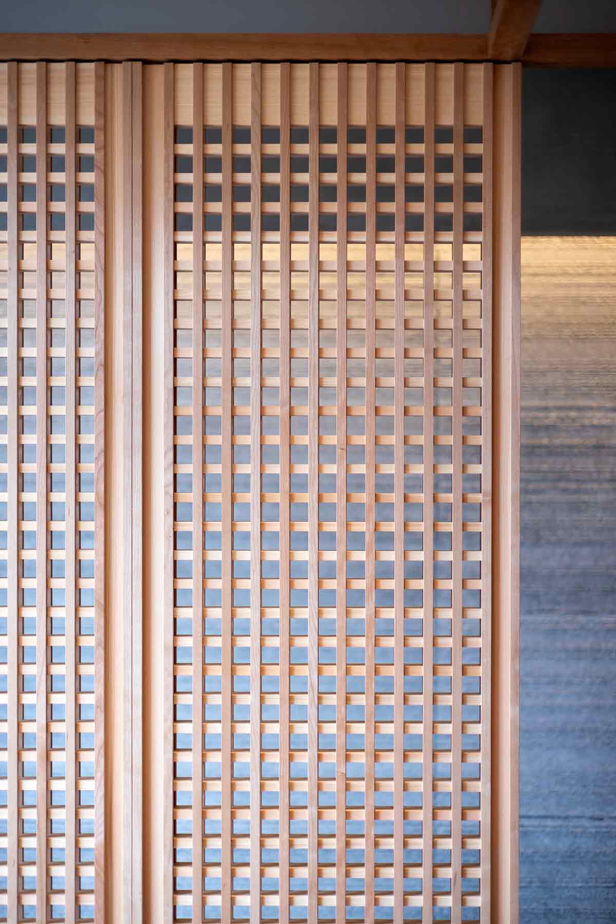 Por otro lado, la zona de la montaña ha sido diseñada con un carácter más íntimo y recogido, gracias al uso de particiones en rejilla que dividen delicadamente el espacio. Estos elementos combinan láminas verticales de hinoki (ciprés japonés) y elementos horizontales de madera de cerezo negro, dando lugar a un diseño entrelazado que evoca la urdimbre y la trama de los tejidos tradicionales.