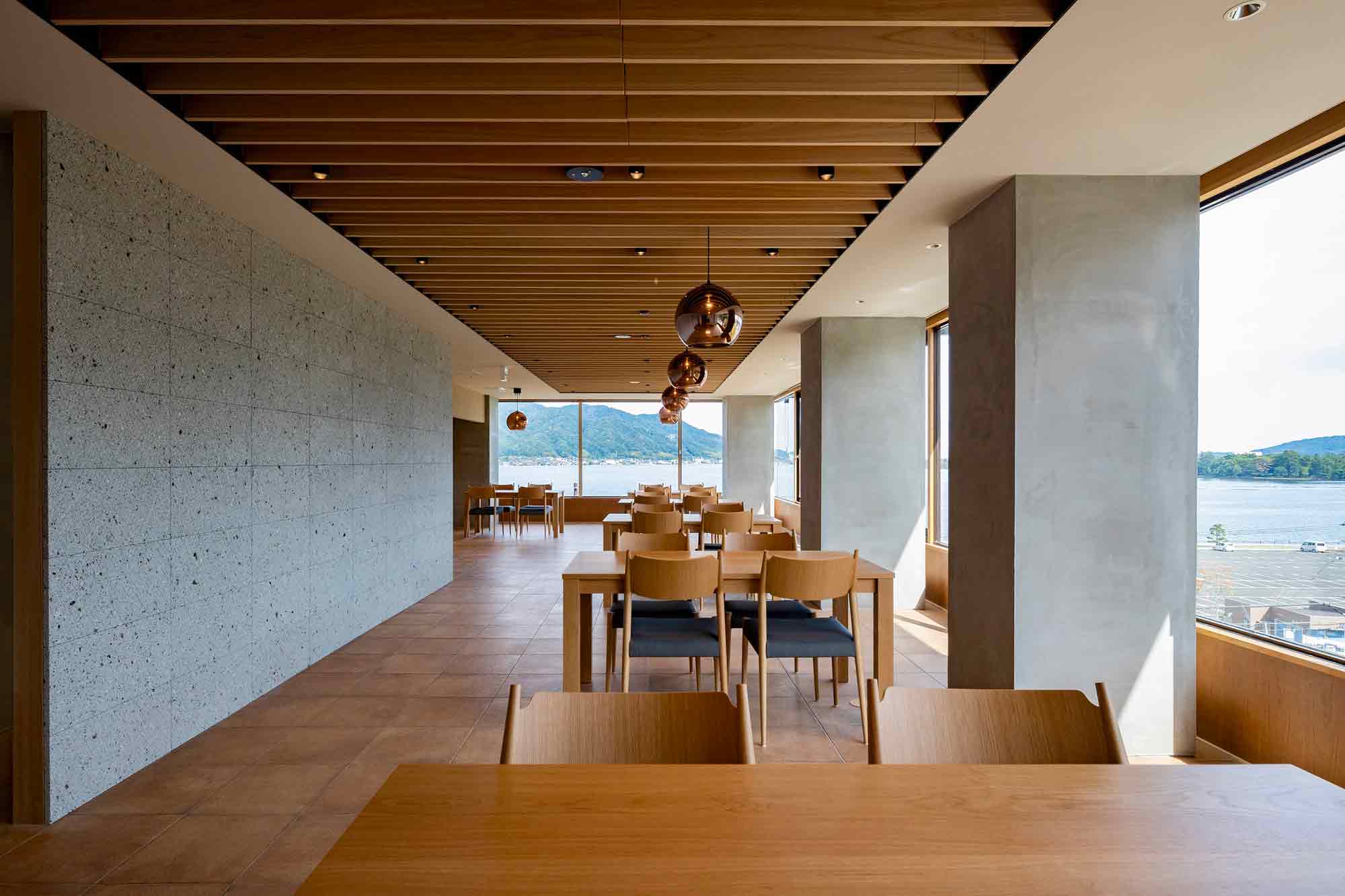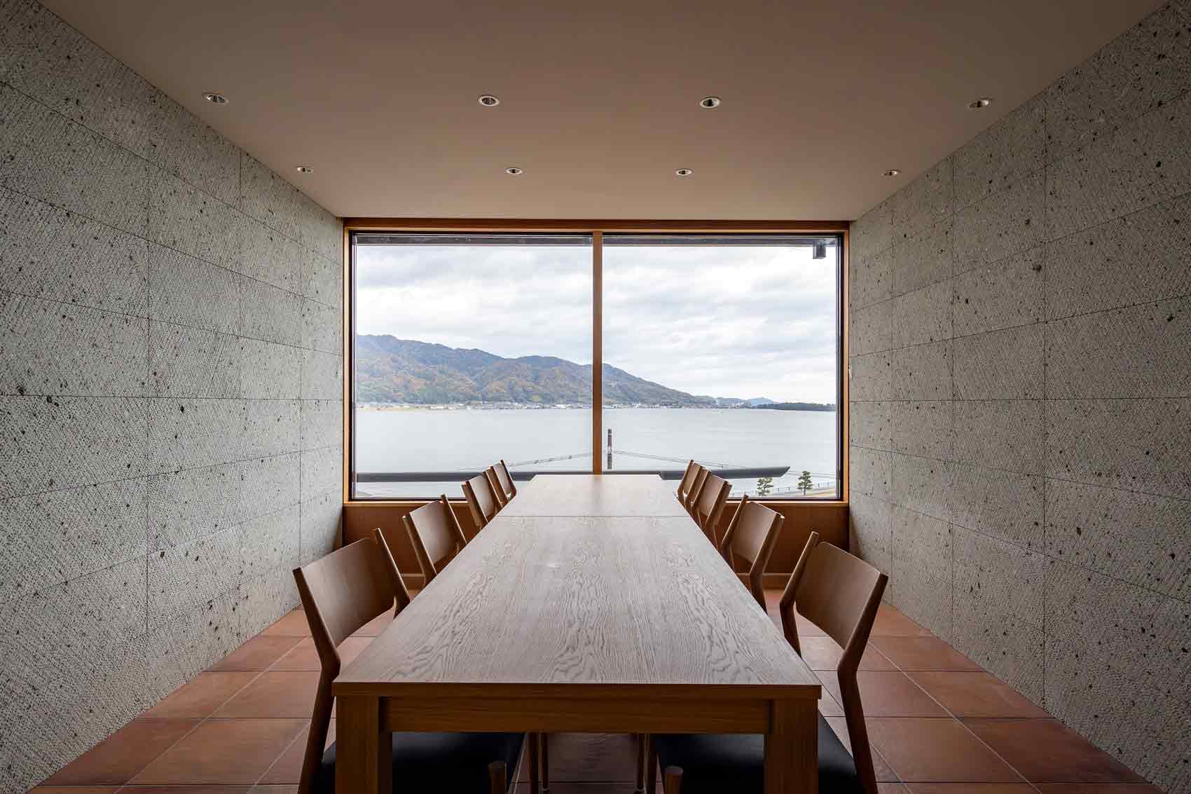 Excluyendo las salas privadas, el área del restaurante está dividida en dos zonas principales: una que mira directamente hacia Amanohashidate y otra en el lado de la montaña, con vistas parciales del paisaje circundante. En la zona frente al mar, los asientos han sido generosamente espaciados para crear un ambiente abierto y aireado, capaz de realzar completamente la vista icónica.