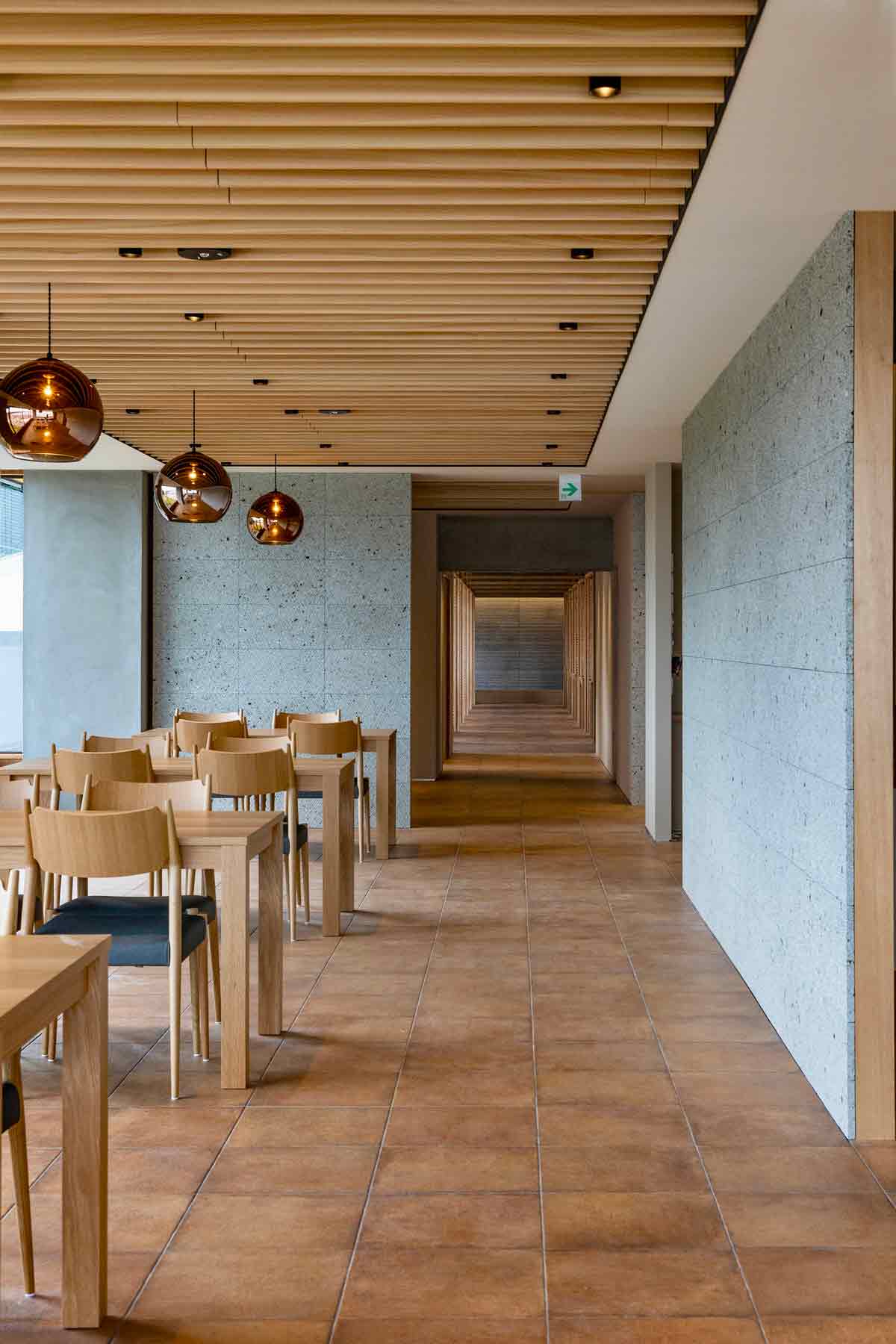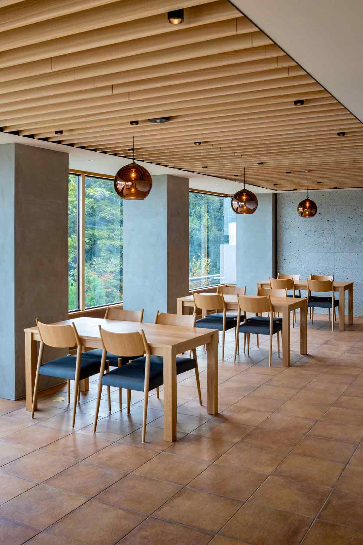 La paleta de materiales - compuesta por piedra de Ōya, azulejos de gres porcelánico rojizo, hinoki y madera de cerezo negro - contribuye a crear una atmósfera cálida, sobria y refinada, en equilibrio entre formalidad e informalidad. El resultado es un espacio que interpreta el diseño de interiores para la restauración como una experiencia sensorial y espacial, en diálogo con el entorno natural y las necesidades funcionales contemporáneas de los proyectos de arquitectura.