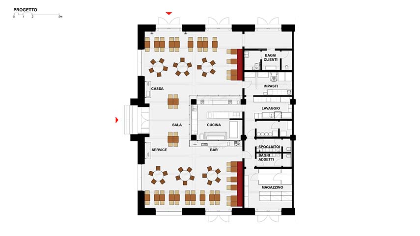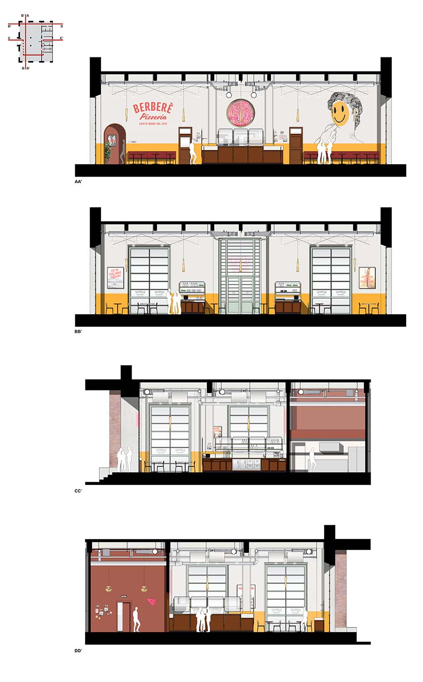 Le projet du local de Berberè au sein de la rénovation urbaine de Manifattura Tabacchi, allie la conservation de la structure originale de Pier Luigi Nervi et un hommage à la Florence de la Renaissance. Des éléments structurels et décoratifs renvoient à l'Église de San Lorenzo, comme les colonnes de béton évoquant des chapiteaux de la Renaissance et le néon en forme de pizza rappelant une rosace. Une attention particulière a été portée à la visibilité de la structure de Nervi, avec l'ajout d'un mur séparateur entre la salle et la cuisine. Les intérieurs sont conçus pour mettre en valeur la convivialité, avec un éclairage étudié et des détails architecturaux qui agrandissent visuellement l'espace. Le local comprend une cuisine ouverte centrale, entourée d'un bar en bois de cerisier et de marbre de Carrare, intégrant parfaitement le contexte industriel avec une touche d'élégance de la Renaissance.