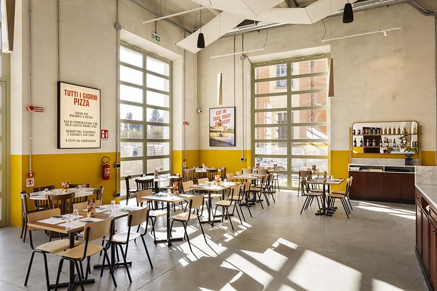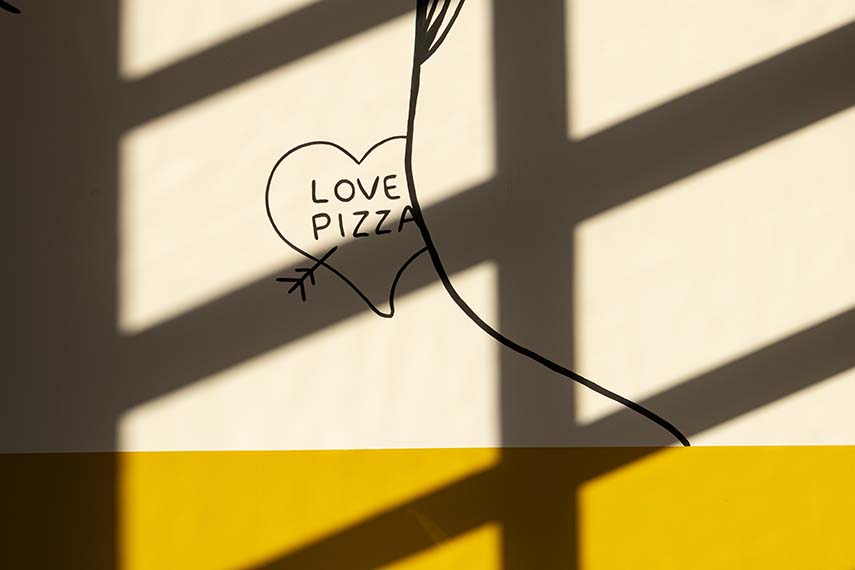 Dès 2010, année d'ouverture de notre première pizzeria, nous avons cherché à introduire l'ingrédient contemporain aussi dans le design, pas seulement dans le produit pizza. D'autre part, dans une pizzeria, on y va pour passer du temps, donc l'expérience est faite de nombreuses choses, pas seulement de la nourriture mais aussi du service, de la musique, du confort et, bien sûr, aussi du design. Nous avons étudié à Bologne, donc probablement la plus grande influence a été donnée par l'art de rue et les couleurs de la ville. De plus, nous aimons beaucoup voyager et observer ce qui se passe à l'étranger, donc il y a des influences internationales, surtout nous pensons à Londres et New York.