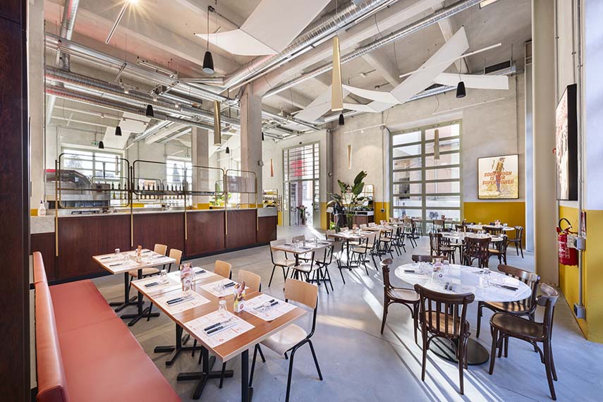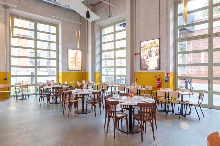 Par exemple, dans l'établissement de Milan Isola, nous avons conservé les sols en mosaïque d'origine. Nous aimons les éléments qui racontent l'histoire des lieux : d'un pont roulant de l'ancienne usine, aux briques apparentes et aux arches des anciens entrepôts de Milan Navigli.