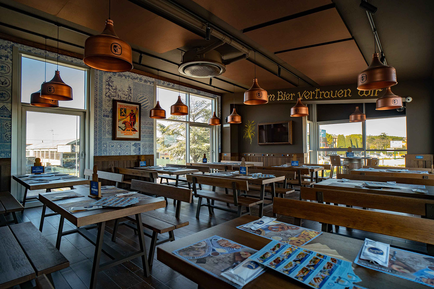 Ispirata ai tradizionali locali bavaresi, il ristorante birreria Löwengrube di Civitanova Marche (MC) unisce lo spirito e l’atmosfera dell’Oktoberfest con il tradizionale senso di accoglienza italiano. Progettato dallo studio Area-17 Architecture & Interiors, il ristorante birreria si sviluppa su tre livelli, per una superficie complessiva di circa 750 mq caratterizzata da ampi spazi pensati per famiglie e gruppi di amici. Il concept del locale pone al centro della scena la birra bavarese, elemento cruciale attorno cui è costruita tutta l’esperienza da vivere all’interno della birreria. Proprio per questo il banco di spillatura spicca nell’ambiente così come la cella delle birre, completamente trasparente con i fusti a vista, che diventa elemento insieme funzionale e decorativo