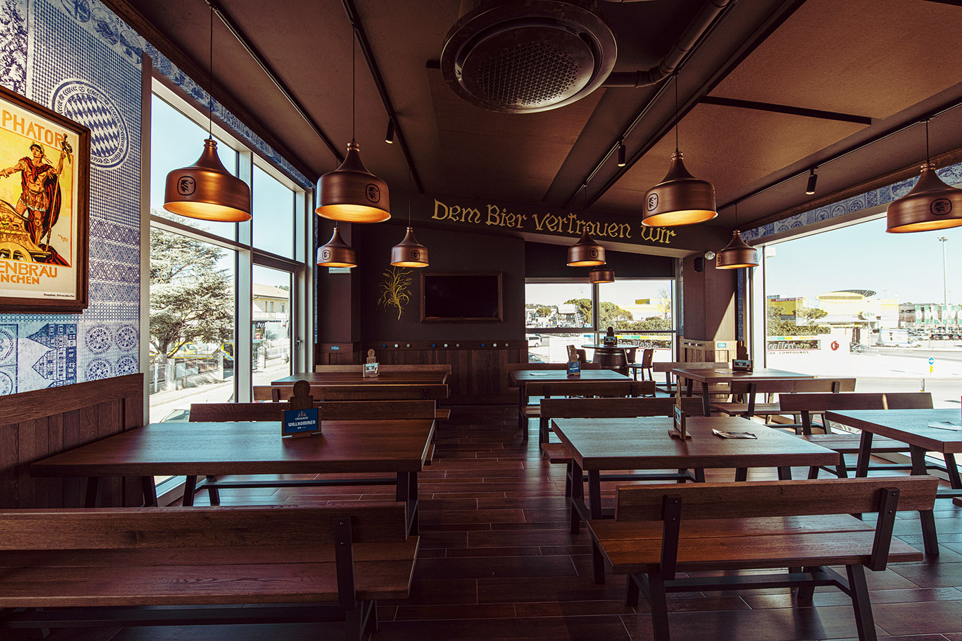 Tavoli comuni, aree più intime con tavolini da due persone e spazi per famiglie con un’area kinder dedicata ai più piccoli caratterizzano il ristorante birreria Löwengrube i cui arredi, dai toni caldi, restituiscono una sensazione di familiarità e benessere. Un’atmosfera piacevole e confortevole creata anche grazie ai pannelli isolspacestyle,applicati sia a soffitto (102 mq di prodotto) sia a parete (circa 6 mq di prodotto). In entrambi i casi le soluzioni Isolmant riprendono lo stile del locale, inserendosi perfettamente nell’architettura degli spazi.I pannelli a soffitto «replicano la tonalità di marrone dei rivestimenti delle sale, grazie a una personalizzazione che ha previsto una minuziosa campionatura del colore. Un processo in più fasi che grazie alla disponibilità dell’azienda ha fatto sì che tutti gli elementi fossero abbinati cromaticamente tra loro» sottolineano gli architetti Francesco Scanu e Bruno Grasso. Sui pannelli a parete, incorniciati come veri e propri quadri, sono stati invece stampati soggetti e dettagli ispirati alla tradizionale iconografia bavarese che caratterizza la brand identity del marchio.