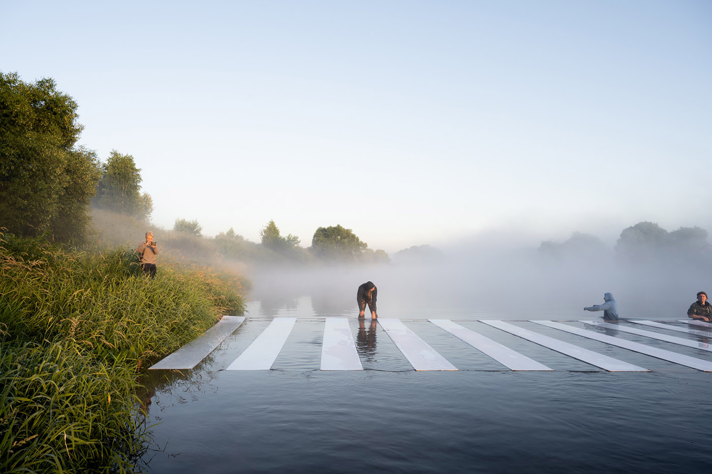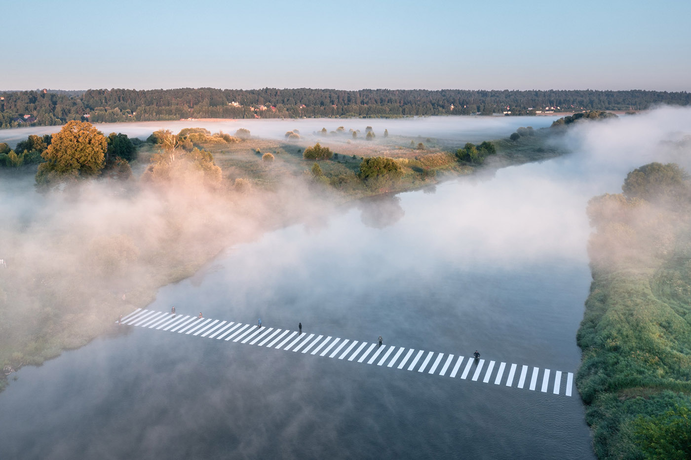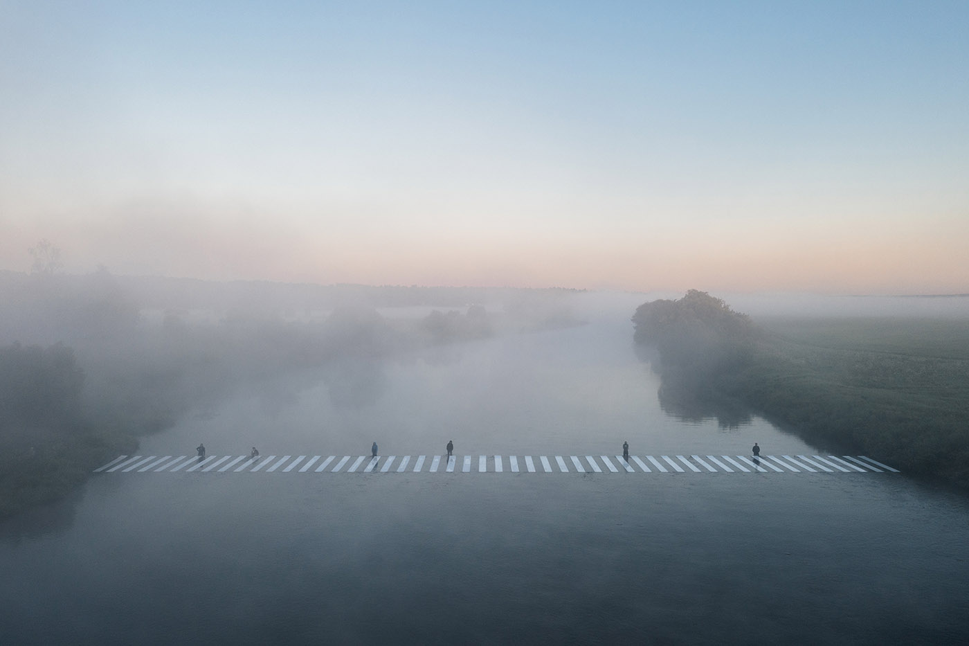 Crossroads de Gregory Orekhov, réalisé en polycarbonate et peint avec de la peinture de marquage, est une traversée à travers la rivière, parmi des champs qui semblent n'avoir aucune fin. Cet objet d'art terrestre est situé dans la région de Moscou, dans la zone de Nikolina Gora. Avec cette œuvre, l'artiste soulève la question du comportement social, éthique et environnemental.