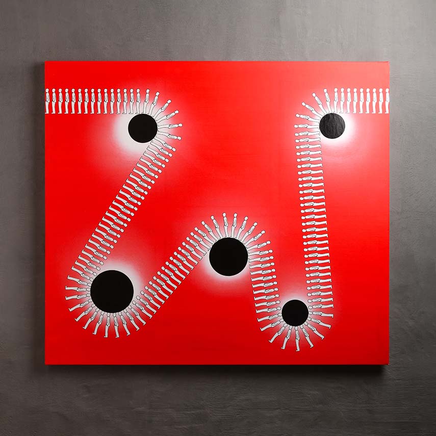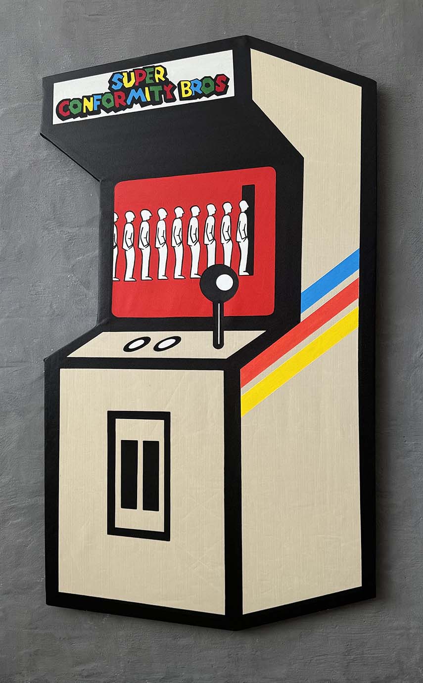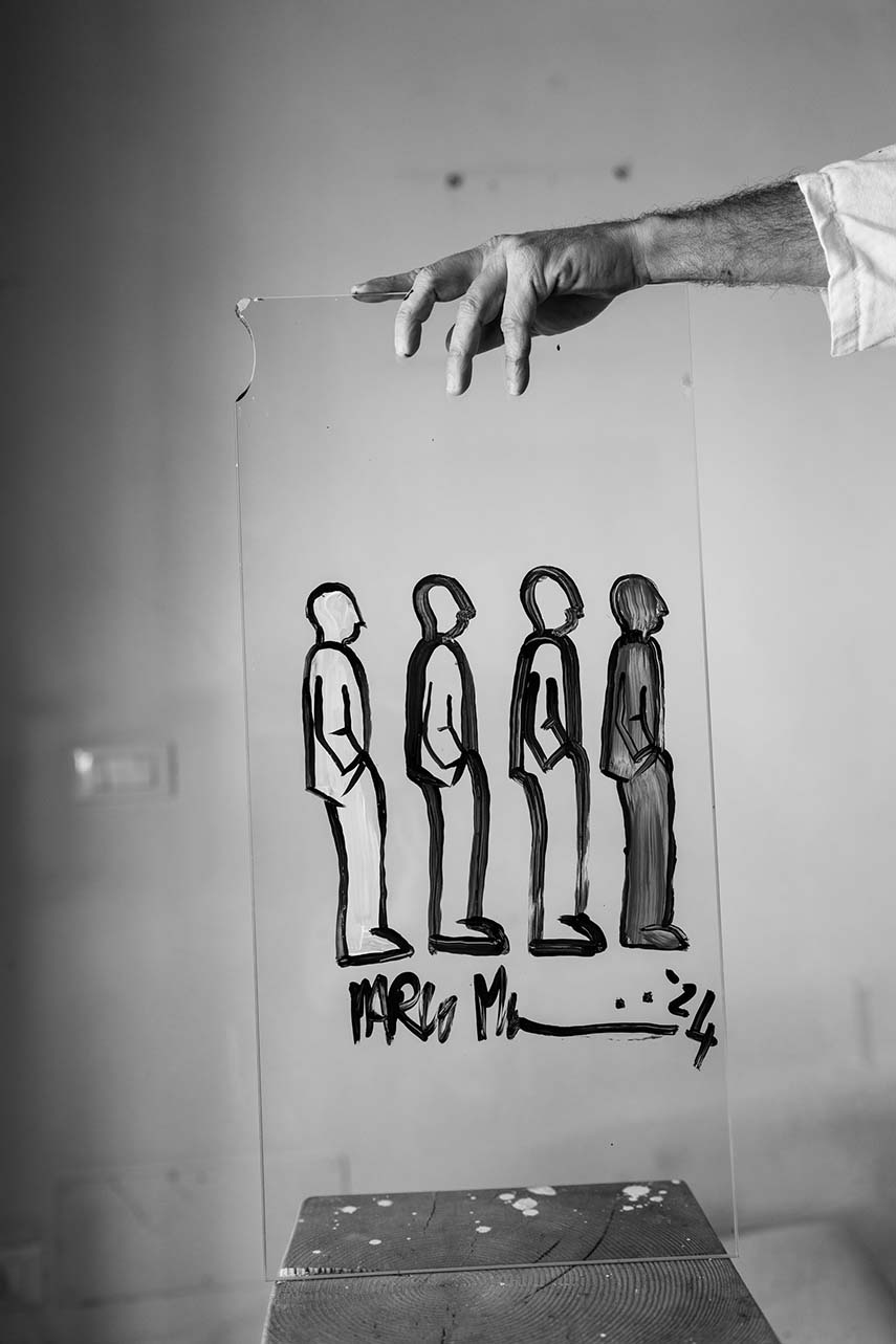 Au cours des dernières années, la recherche créative de Marco Morosini a exploré un thème actuel : l'aliénation de l'homme dans la société moderne. À travers un langage visuel fortement influencé par le mouvement de la Pop Art et par la graphique commerciale, Morosini représente des sentiments d'isolement, d'anonymat et de conformisme. C'est ainsi que la série Uominiuomini, un hommage provocateur à la production de masse, est née. Chaque petit homme, dépourvu de traits distinctifs et vêtu de manière uniforme, est reproduit mécaniquement. Ces figures archétypales ont été inspirées par des icônes de la Pop Art telles que Roy Lichtenstein et Andy Warhol, et ont été créées à l'aide de techniques sérielles. À une époque dominée par l'intelligence artificielle, Morosini revendique la nécessité d'œuvres réalisées par l'homme pour l'homme. Actuellement, Uominiuomini REFLEX est exposé à l'espace d'Orea Malia, situé via Ugo Bassi à Bologne.