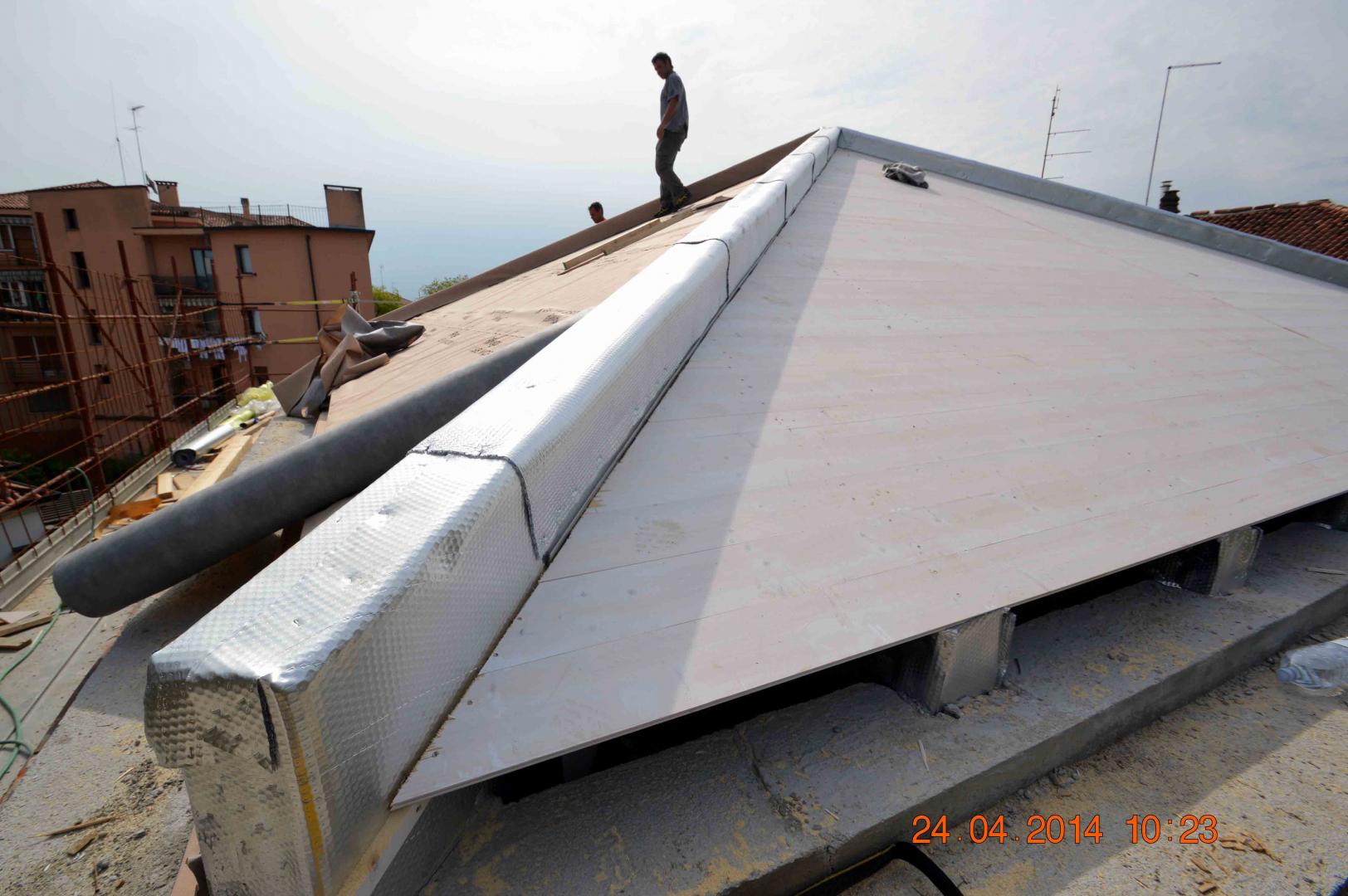 L'intervento ha inoltre previsto l'inserimento di una nuova struttura per il solaio e per la copertura rispettivamente in legno X-lam e lamellare. Tale inserimento ha creato la necessità di disaccoppiare le nuove strutture dalla muratura perimetrale esistente. Il disaccoppiamento é stato raggiunto grazie all’isolante termoriflettente Over-foil SuperStrong posto a diretto contatto con le parti lignee