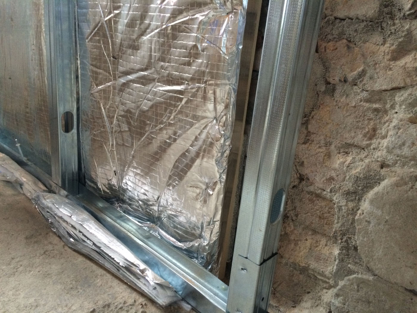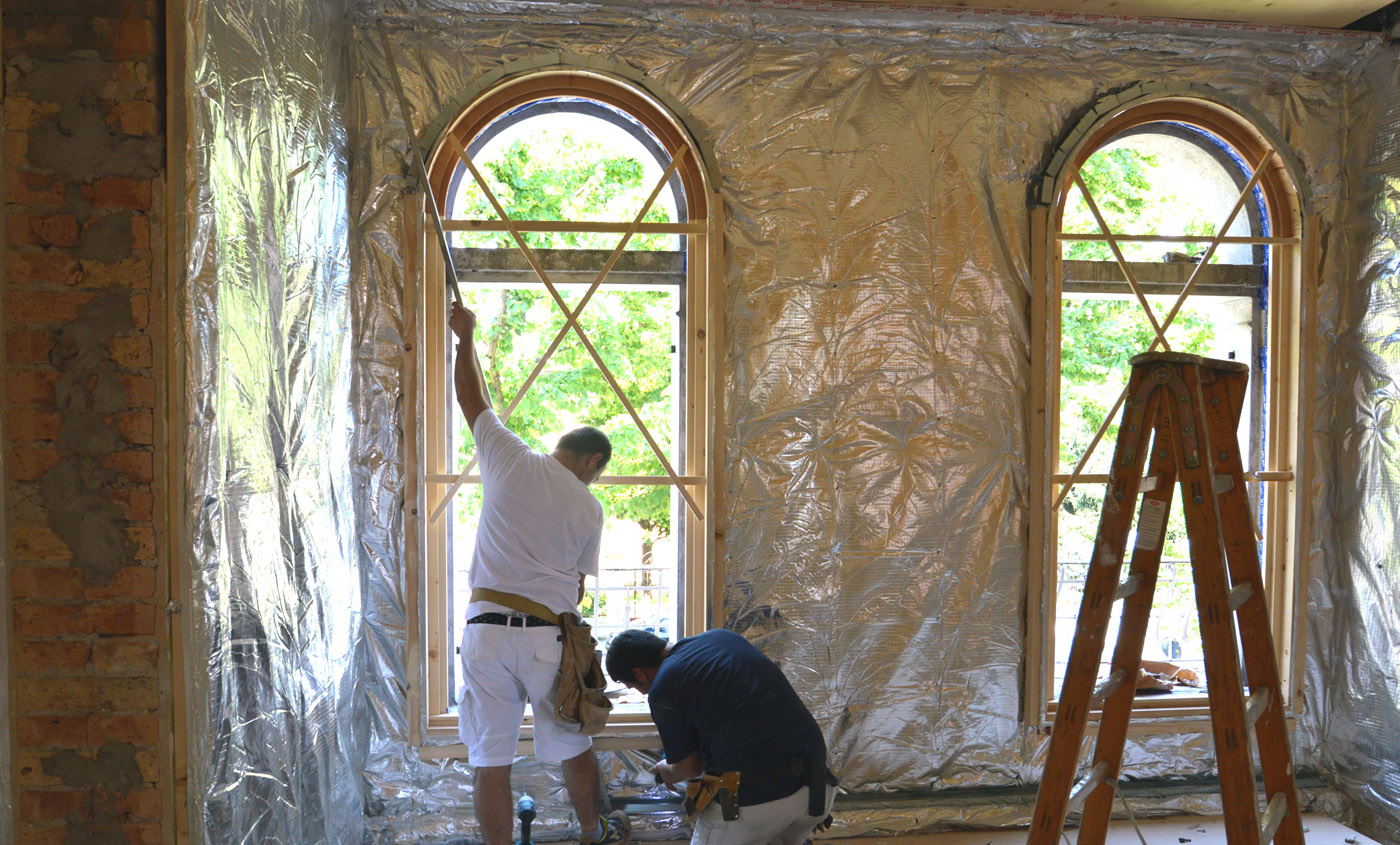 Soluzione ideale é stata la coibentazione interna in controparete con isolante termoriflettente Over-foil Multistrato 19 SuperQuilt posato tra listellatura di legno da 35 mm e struttura metallica di supporto delle lastre di cartongesso