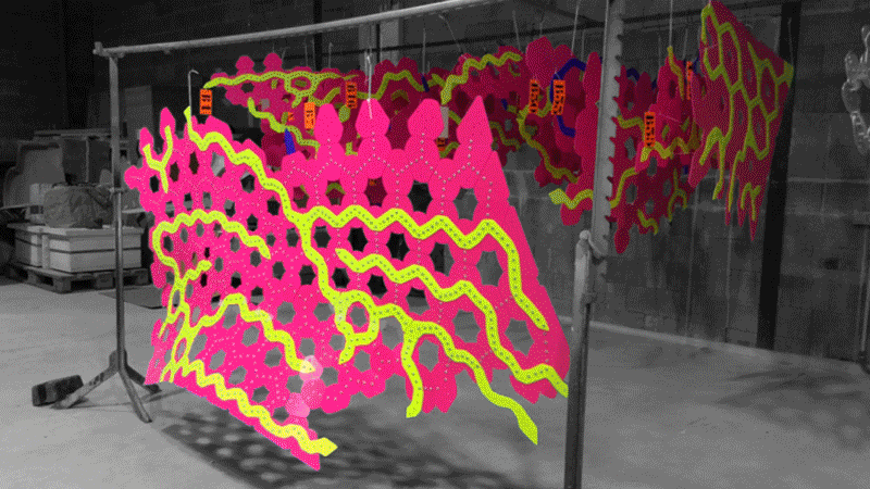 Marc Fornes / Theverymany creates a work that combines art and architecture, exploiting the lightness of aluminium, which is suspended between the 16 bridges of the ship. An interplay of fluorescent colours that intersect to detach the viewer from their daily lives