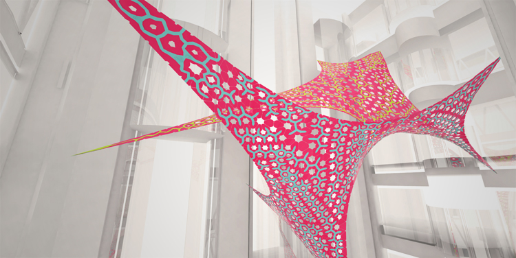 Tour de Force (s) is designed through the tension of the "meshes" that are anchored in 23 fixed points and subjected to physical forces, resulting in a curved 3D perimeter. As the sculpture rises through the lobby's back column, a juxtaposition of colours is revealed