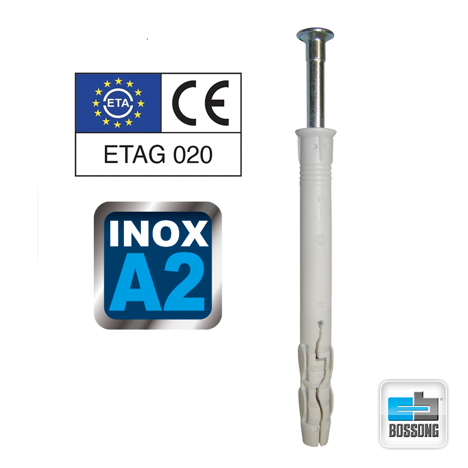 JNS-FOR-XBX4. Cheville Bossong en nylon. Vissage, vis torx T30-40, tête fraisée, acier inoxydable