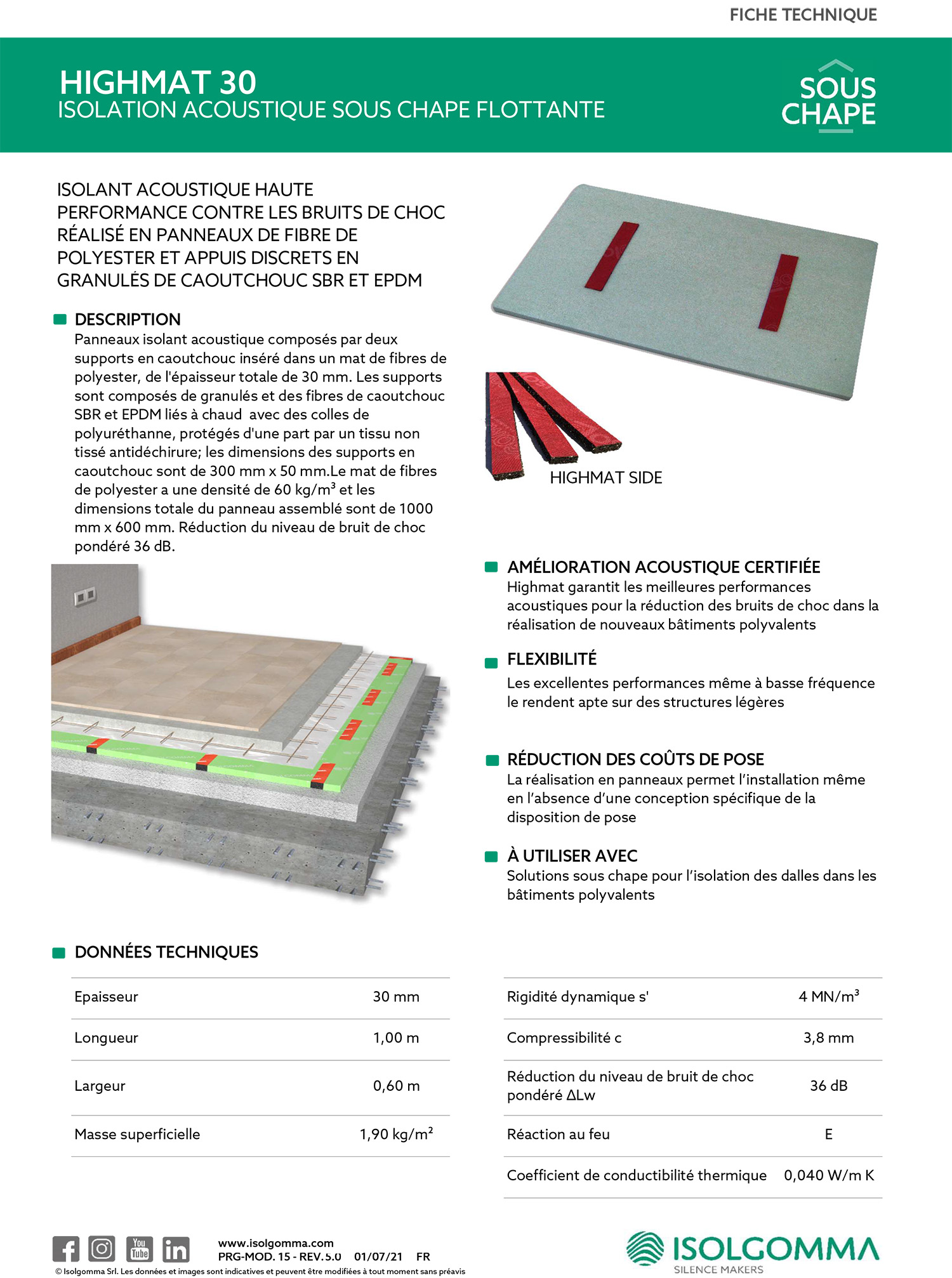 L'isolant acoustique Highmat est composé de panneaux avec deux supports en caoutchouc insérés dans un matelas de fibre de polyester. Les supports, de dimensions 300 x 50 mm, sont en granulés et fibres de caoutchouc obtenus à partir de recyclage de PNEU et EPDM, agglomérés avec des adhésifs polyuréthaniques dans un processus à chaud, protégés d'un côté par un tissu non-tissé synthétique anti-déchirure.