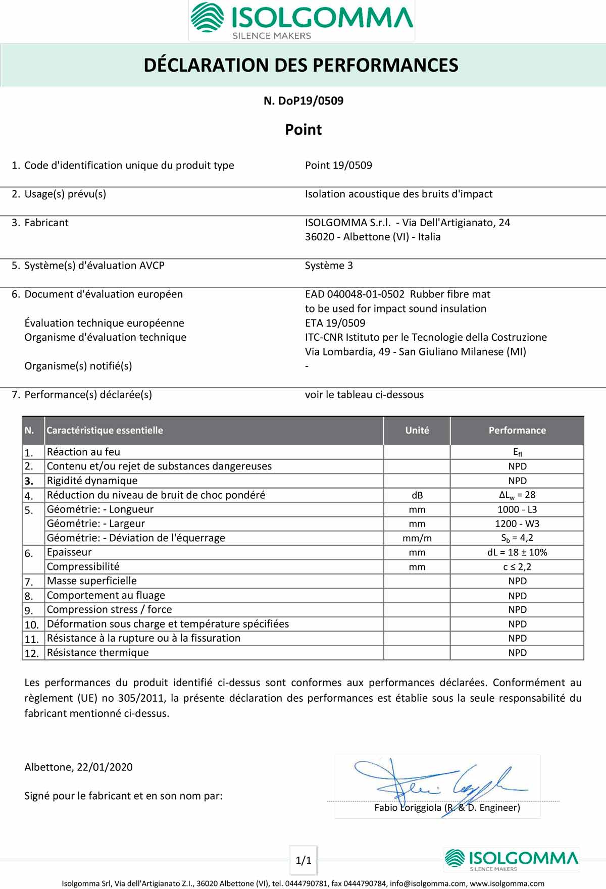 Des performances acoustiques élevées, capables d'assurer une stabilité dans le temps pour des charges élevées allant jusqu'à 5000 kg/m², sont les principales caractéristiques de Point.