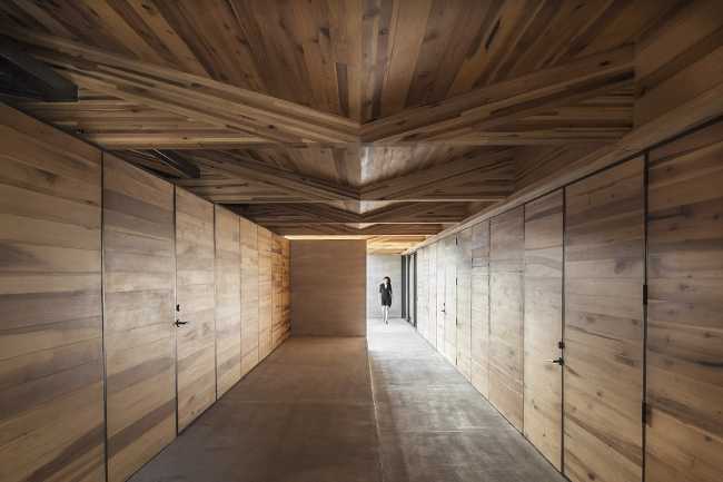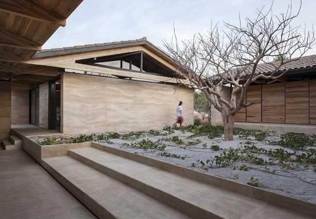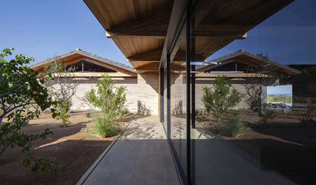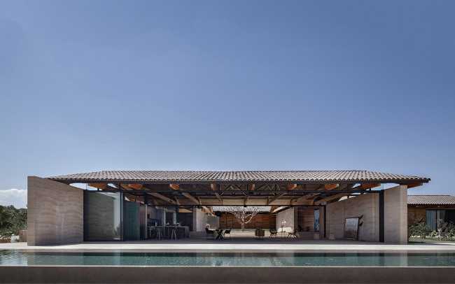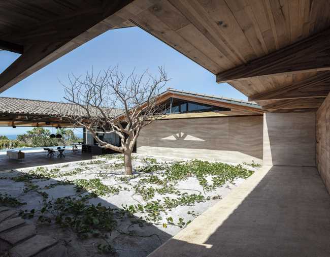 I muri di terra compattata sembrano emergere dalla sabbia tra rocce e vegetazione, supportando le armature dei tetti, offrendo privacy all'interno dello spazio e incorniciando la vista verso il mare. Quattro tetti monumentali a due falde definiscono il ponte che sembra levitare, essendo un elemento chiave nella configurazione della della casa e generando separazioni e gerarchie in ciascuno degli spazi risultanti grazie alle diverse altezze