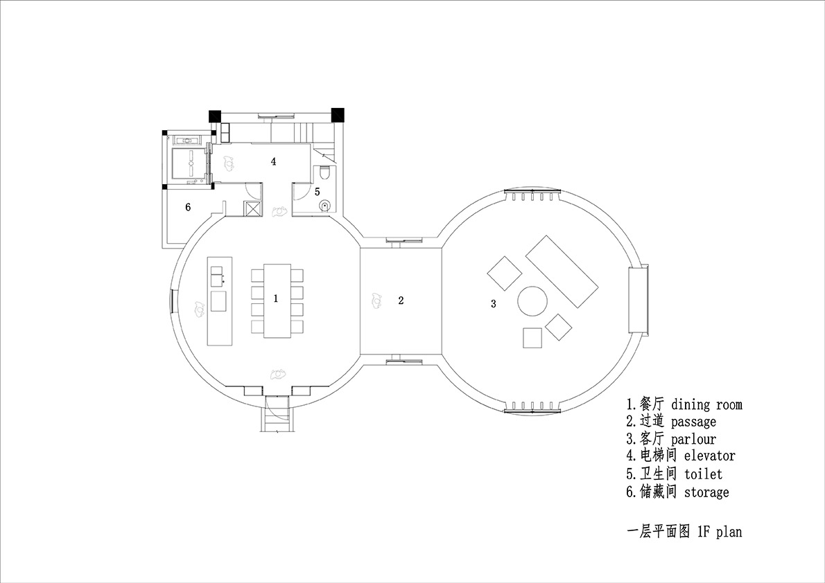 Due aree rotonde sono rispettivamente utilizzate per la sala da pranzo aperta e il salotto, che sono implicitamente separati da un passaggio con pavimento sopraelevato e soffitto abbassato. Il salone conserva l'originale soffitto in cemento grezzo, con il pavimento rivestito in legno di rovere strutturato. Le sue pareti sono rifinite con polvere di guscio e terra mescolata dal progettista stesso, che portano il carattere austero dei villaggi cinesi
