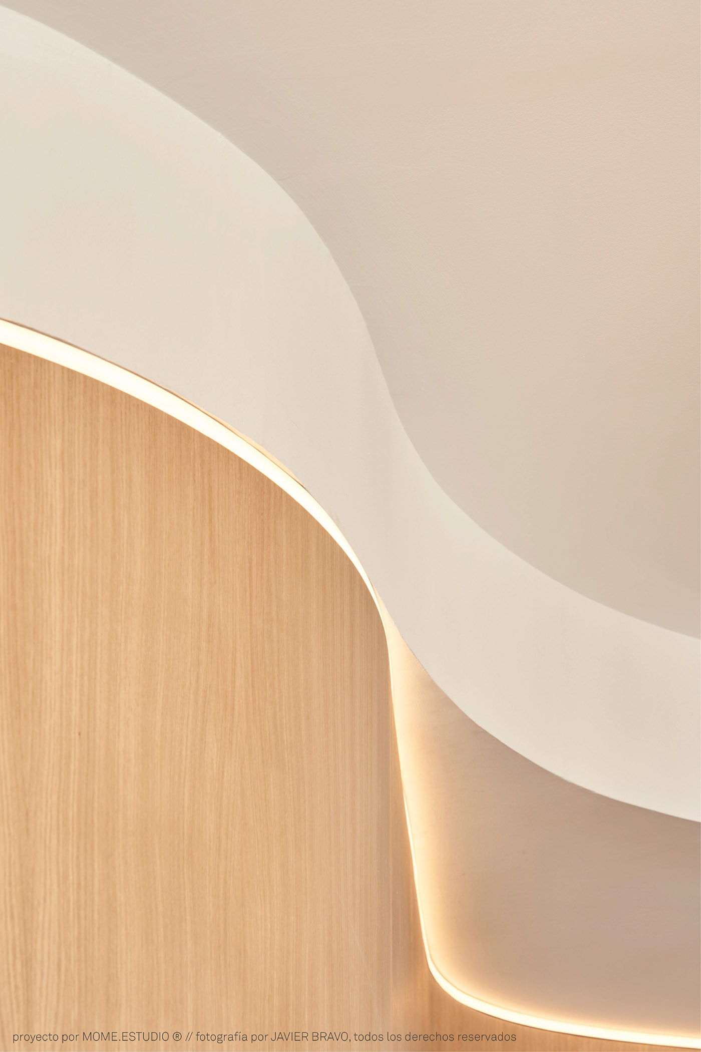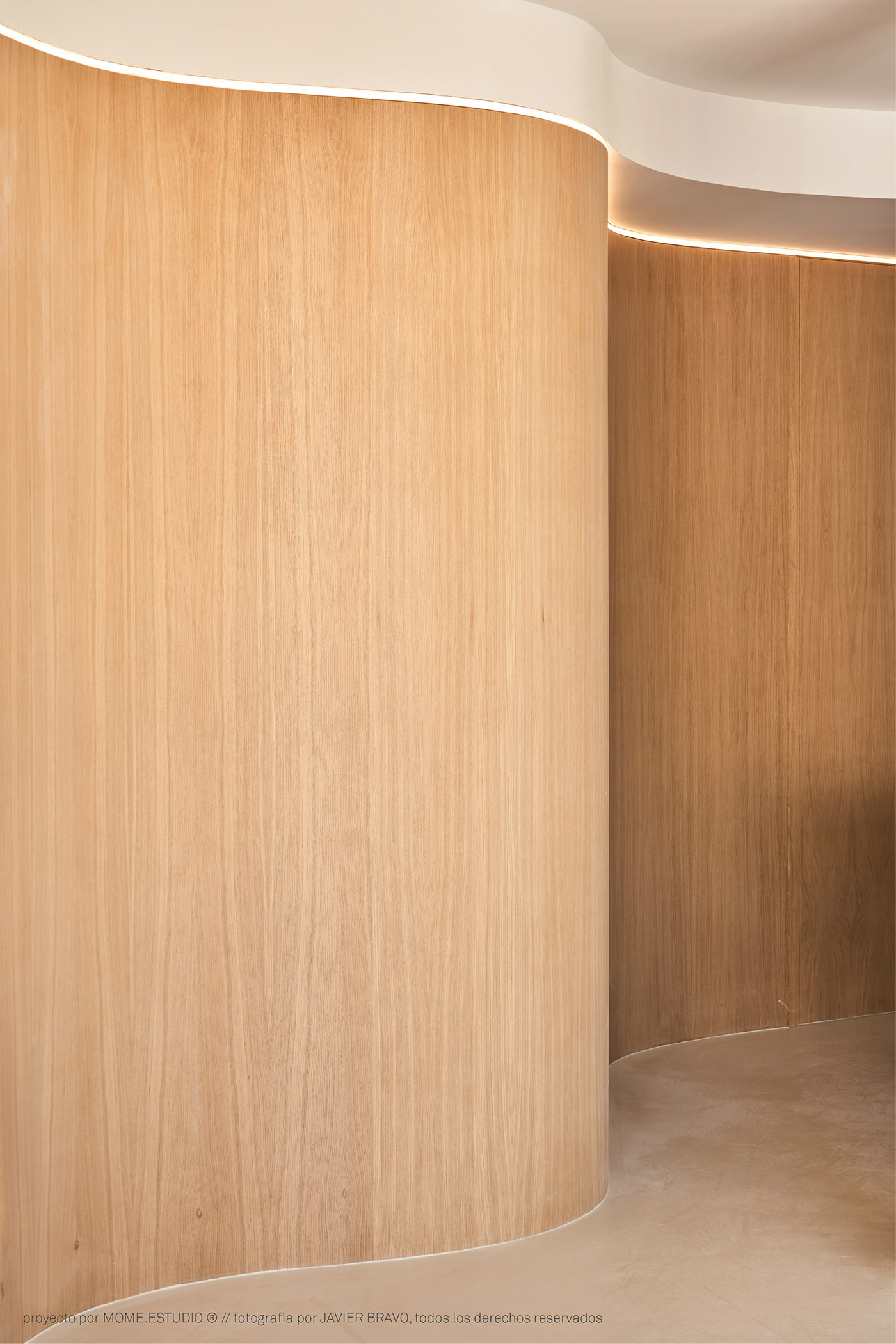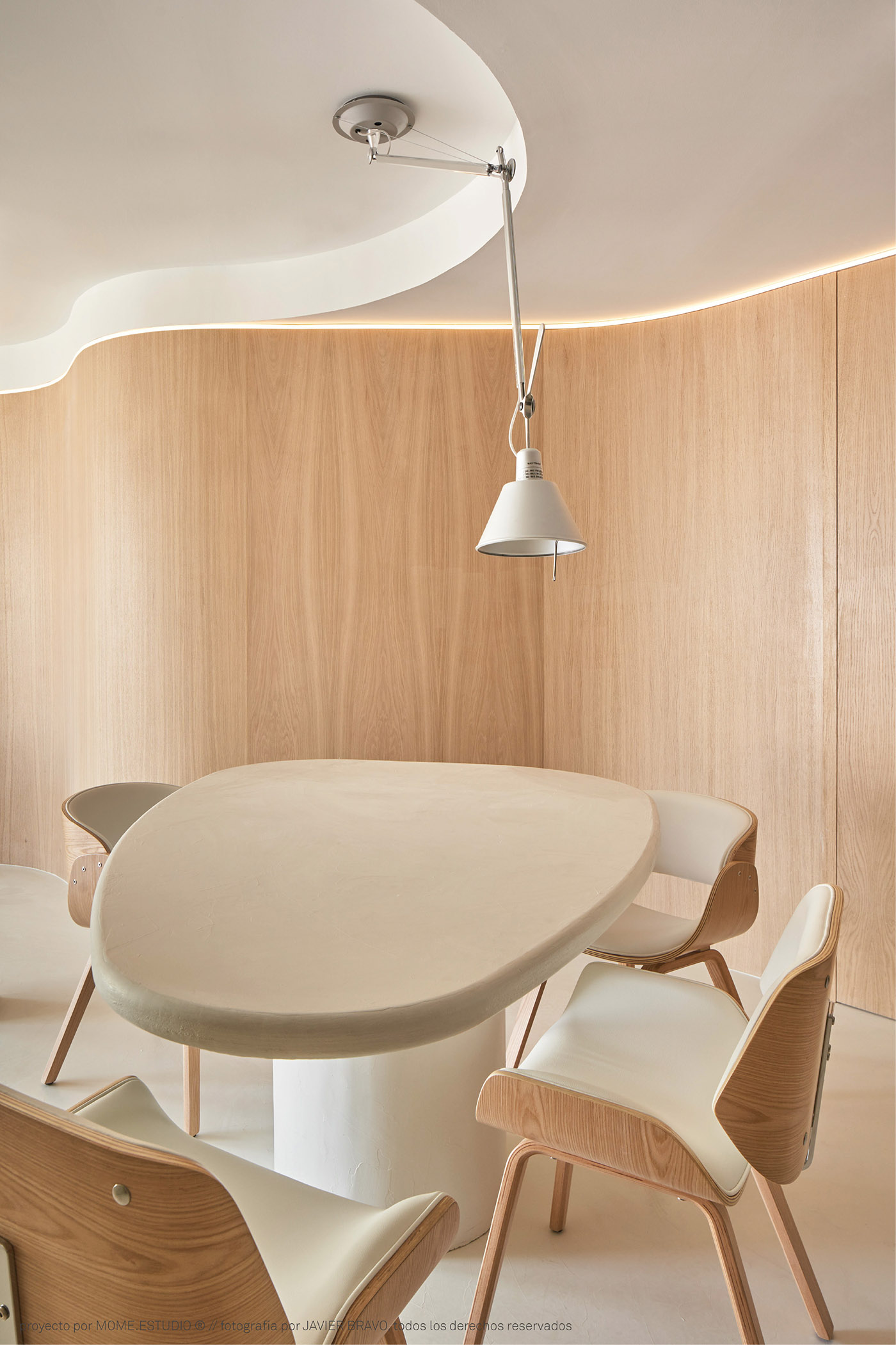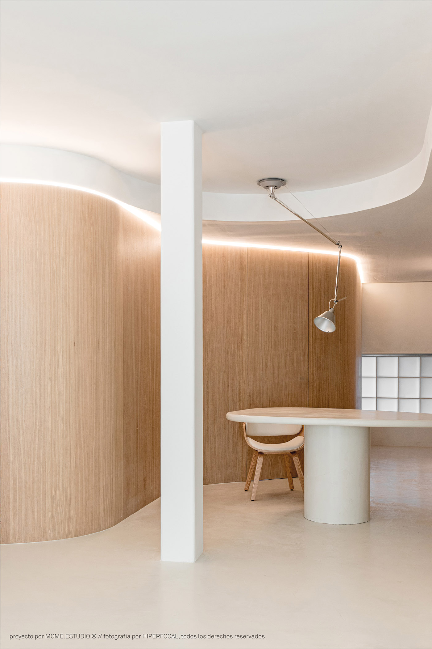 MOME.estudio, in its project for the interior for the EMB apartment, came up with a wooden storage wall that runs the length of the space: this serves as storage and separates the bedroom from the living room on one side, while at its end it transforms into a flexible work area. This multifunctional band of natural oak wood crosses the house longitudinally following a curved path, ensuring that the bedroom and dressing area do not encroach on the kitchen and dining room, leading to a flowing common area where kitchen-dining room-living room follow each other in a natural way