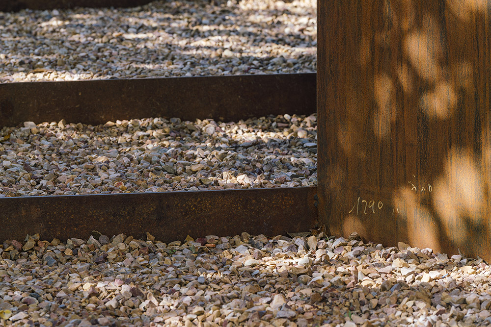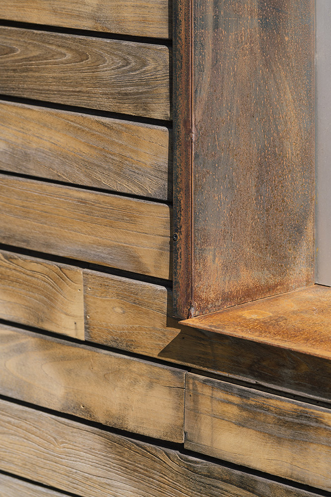 La deuxième pièce, quant à elle, est un module préfabriqué en acier corten également conçu sur mesure. Grâce à un filtre, le soleil est ombragé au coucher du soleil, créant un antichambre à la maison. Les deux pièces sont l'une opaque et mystérieuse et l'autre large et exposée.