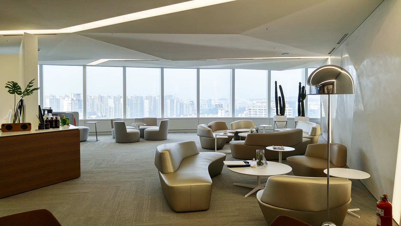 The 23 floors pay homage to traditional elemental Asian design, with hints of gold and green colours with warmer tones and wood in contrast to white cement. The entrance creates a relaxed atmosphere while the open-plan lounge areas are more dynamic within an environment with incredible views over the whole of Seoul