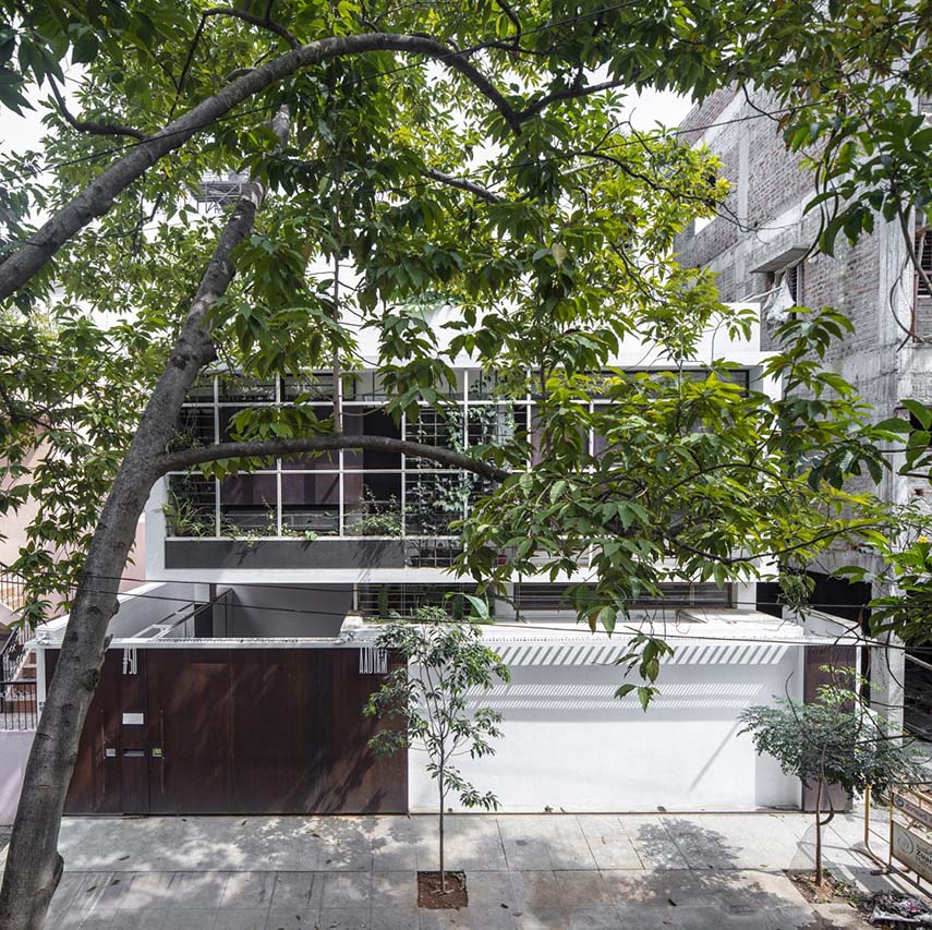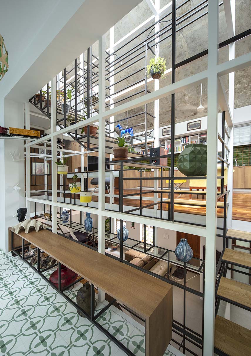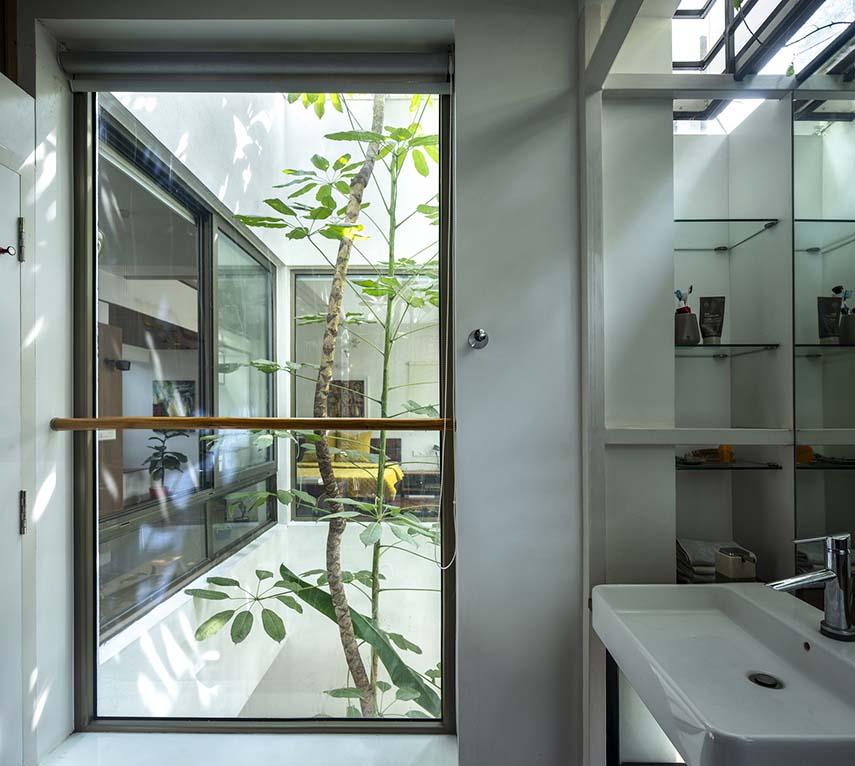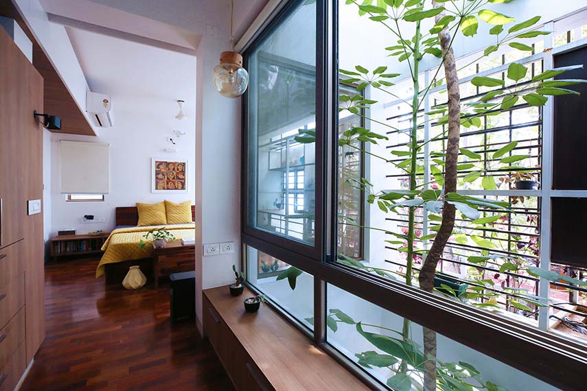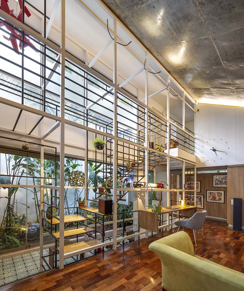 Le jardin surélevé devient le cœur de la maison, offrant des vues agréables aussi bien au rez-de-chaussée qu'au premier étage ; c'est également la source centrale de lumière et de ventilation pour la maison. Une galerie le longe avec de grandes portes en verre pliantes. Le premier étage tourne autour de la mezzanine et abrite deux chambres avec un grand espace hybride au centre qui s'aligne avec le jardin central : un espace qui sert de repaire, de bibliothèque, de coin salon, de salle audiovisuelle et de deuxième salon pour le couple.
