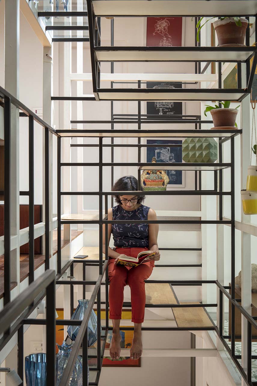 Un autre élément fondamental qui détermine l'architecture de la maison Aadyam est la complexe géométrie en cadre des escaliers : le cadre Steel Space, un arbre vertical central qui relie tous les espaces. Deux ensembles de géométries se combinent pour créer un royaume spatial alors que l'on se déplace du rez-de-chaussée traditionnel à l'énergie vibrante des niveaux supérieurs, devenant le langage à travers lequel chaque espace perçoit l'autre. Les espaces d'Aadyam sont extravertis et en même temps réfléchis, égoïstes et généreux, jouant double jeu et honnêtes en même temps.